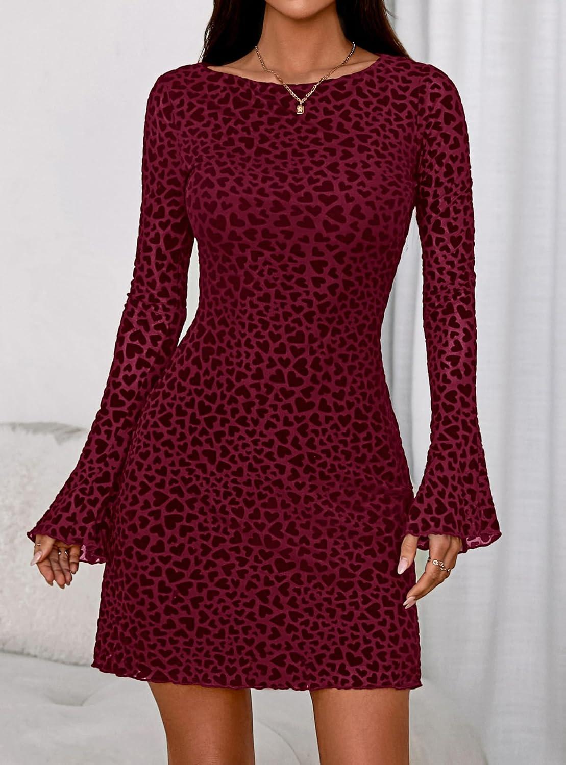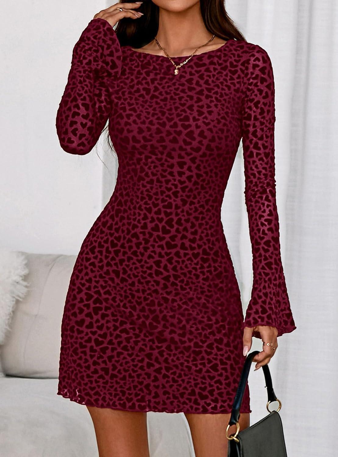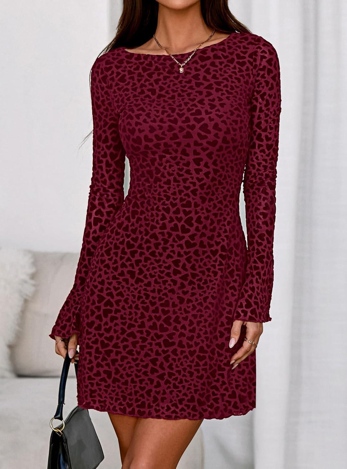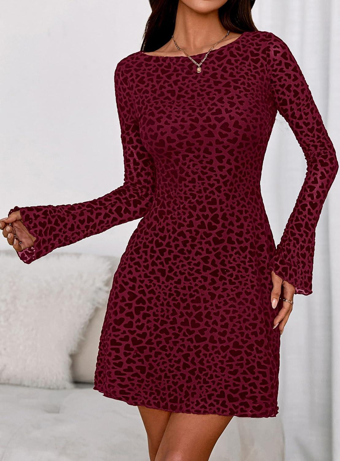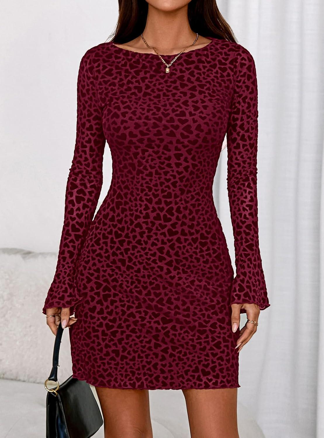 PRETTYGARDEN Women's 2025 Fall Fashion Floral Long Sleeve Mini Dress Mesh Bodycon Short Party Date Night Going Out Dresses(Floral Wine Red)