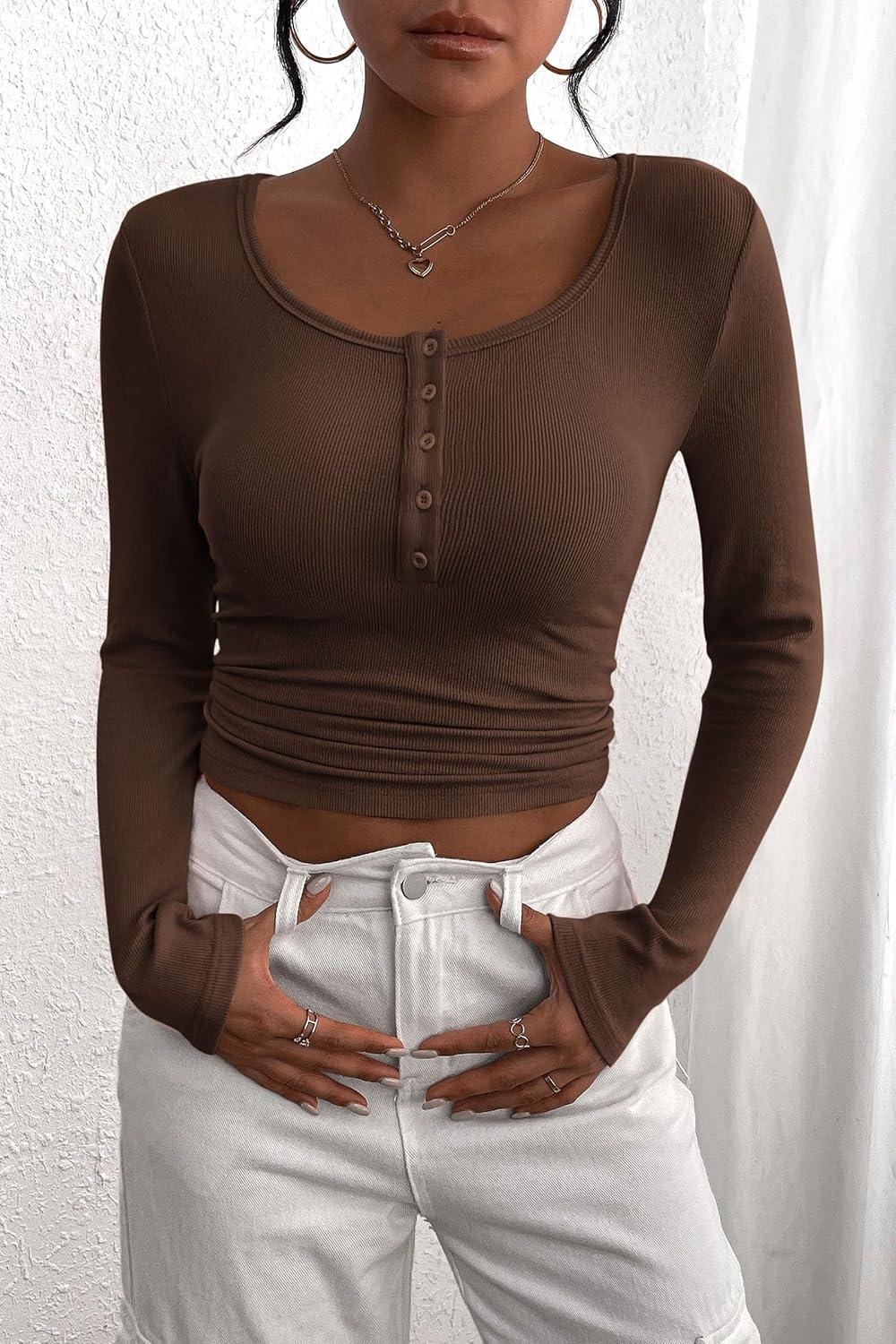 PRETTYGARDEN Women’s 2025 Fall Long Sleeve Henley T Shirts Button Ribbed Knit Slim Fit Basic Tops Blouse Casual Outfits(Coffee)