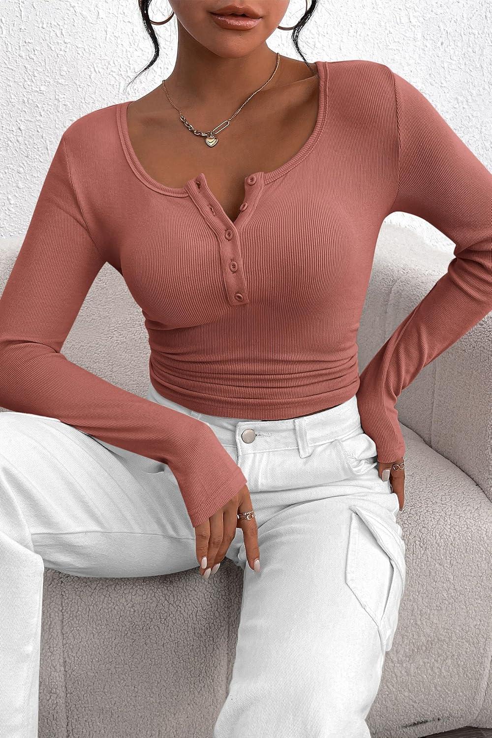 PRETTYGARDEN Women’s 2025 Fall Long Sleeve Henley T Shirts Button Ribbed Knit Slim Fit Basic Tops Blouse Casual Outfits(Heather Pink)