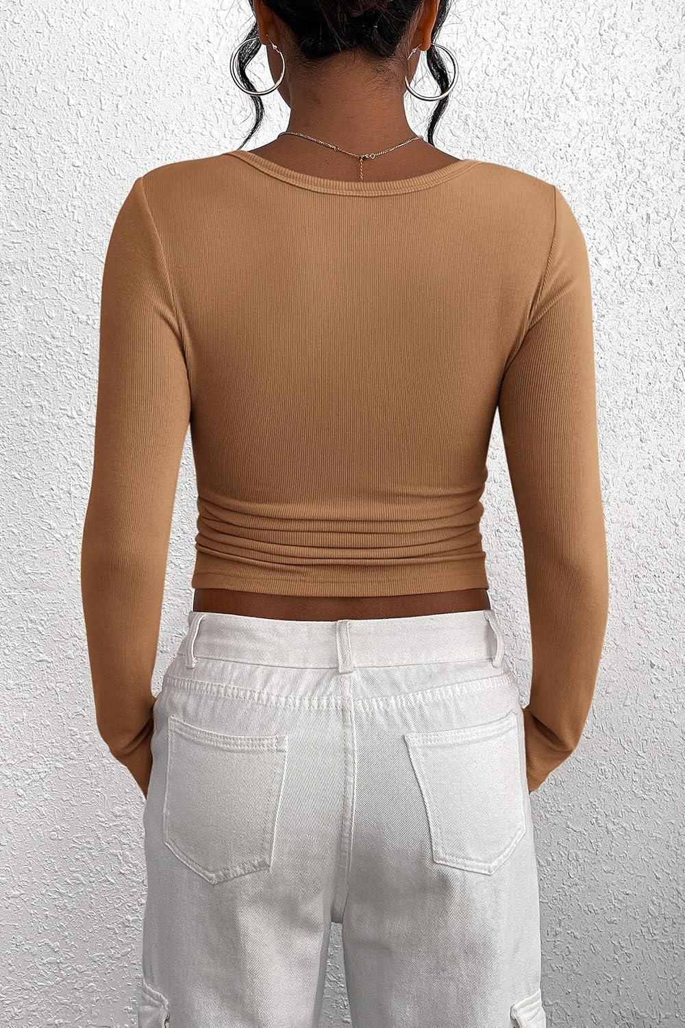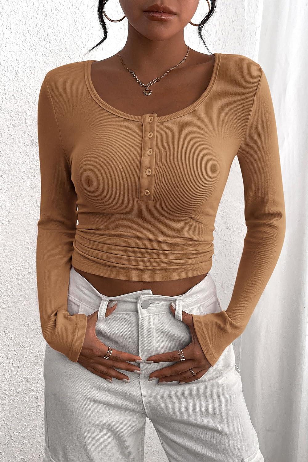 PRETTYGARDEN Women's 2025 Fall Long Sleeve Henley T Shirts Button Ribbed Knit Slim Fit Basic Tops Blouse Casual Outfits(Light Camel)