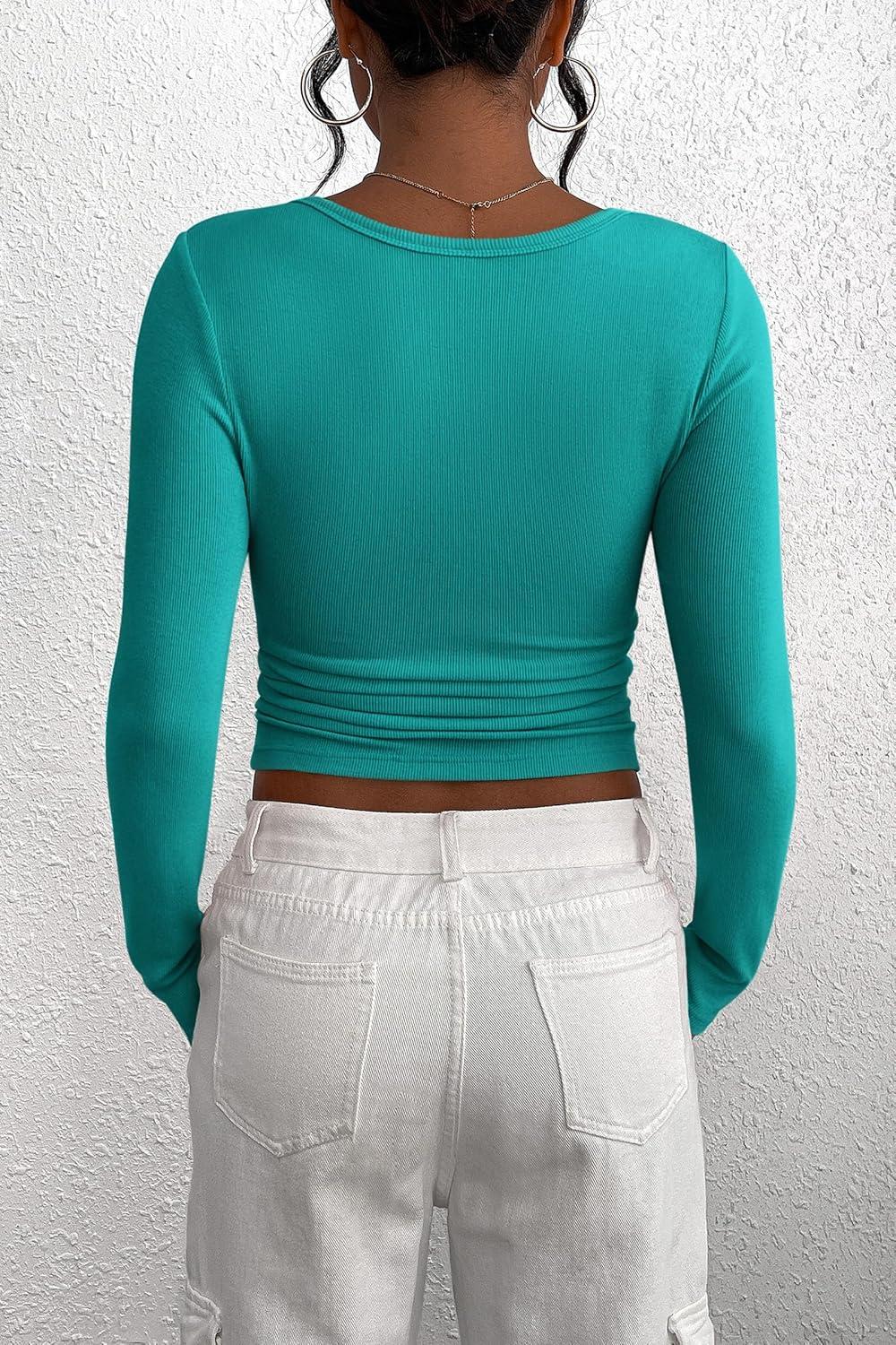 PRETTYGARDEN Women's 2025 Fall Long Sleeve Henley T Shirts Button Ribbed Knit Slim Fit Basic Tops Blouse Casual Outfits(Malachite Green)