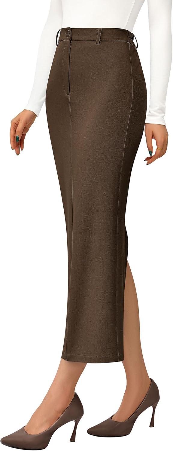 PRETTYGARDEN Women's 2025 Fall Maxi Pencil Skirt High Waisted Slit Work Office Trendy Long Skirts Business Casual Outfits(Brown)