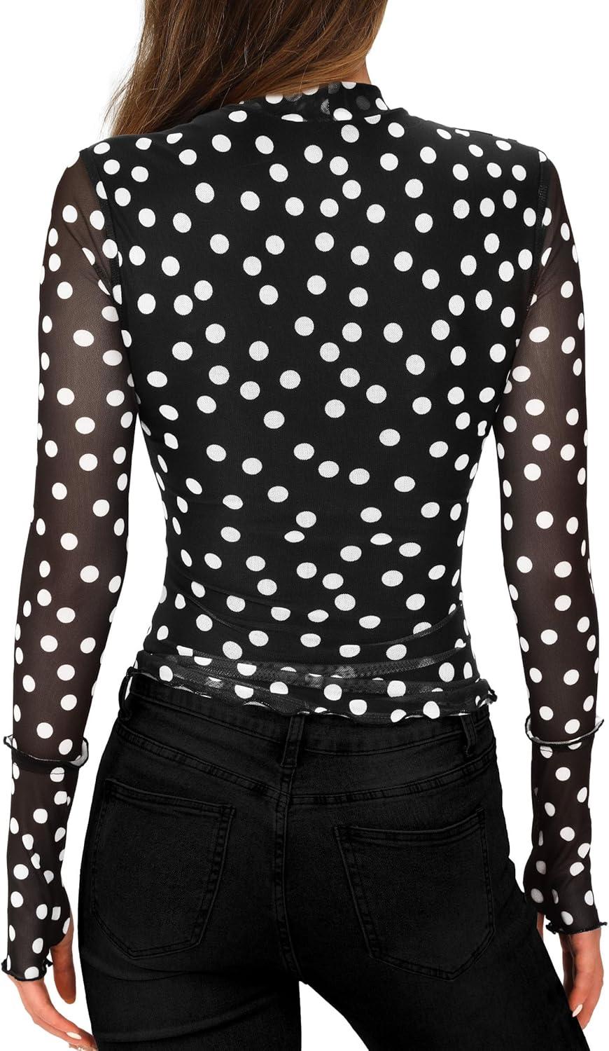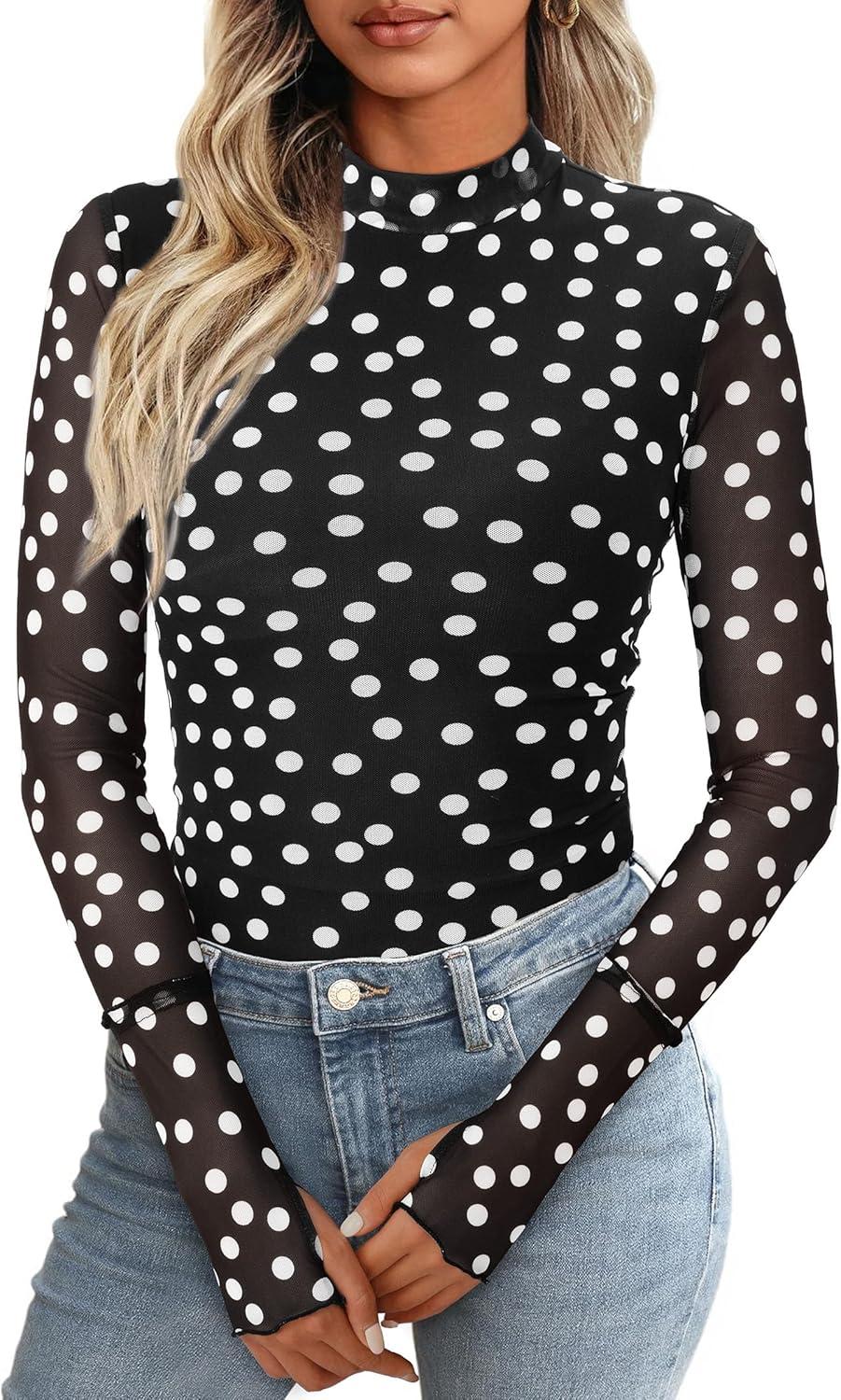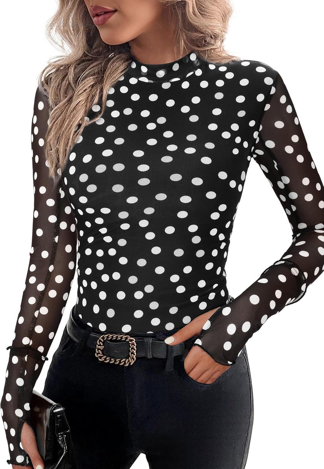 PRETTYGARDEN Womens 2025 Fall Mesh Floral Blouses Long Sleeve Going Out Tops Slim Fitted Shirts Date Night Outfits(01 Dot Black White)