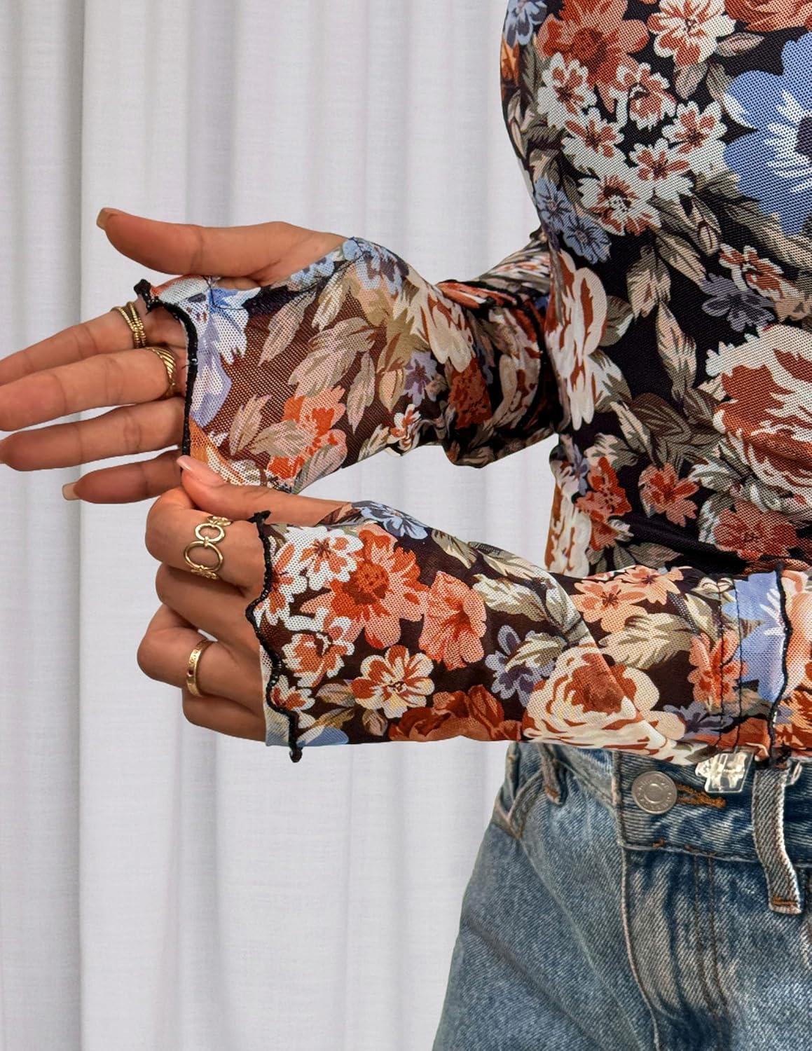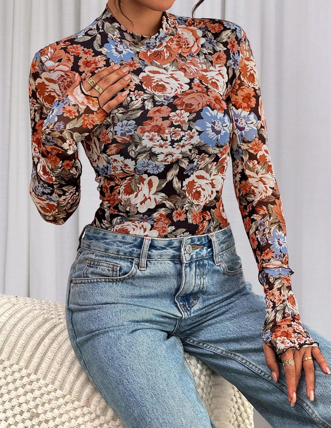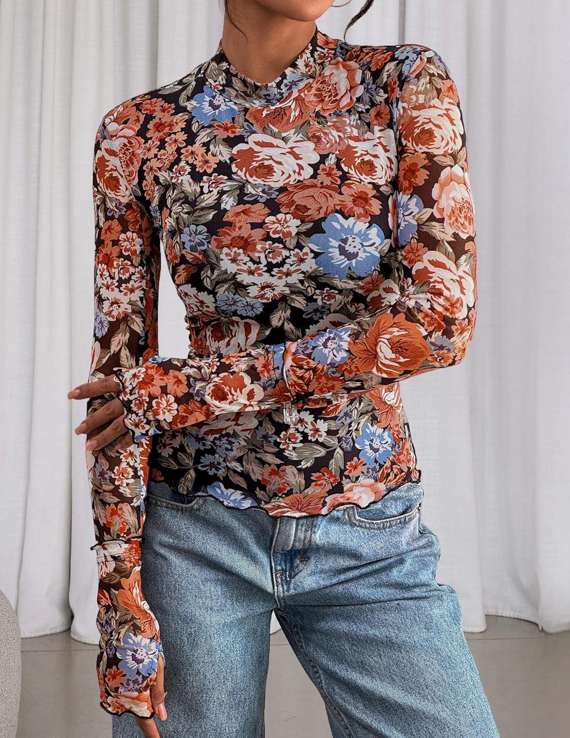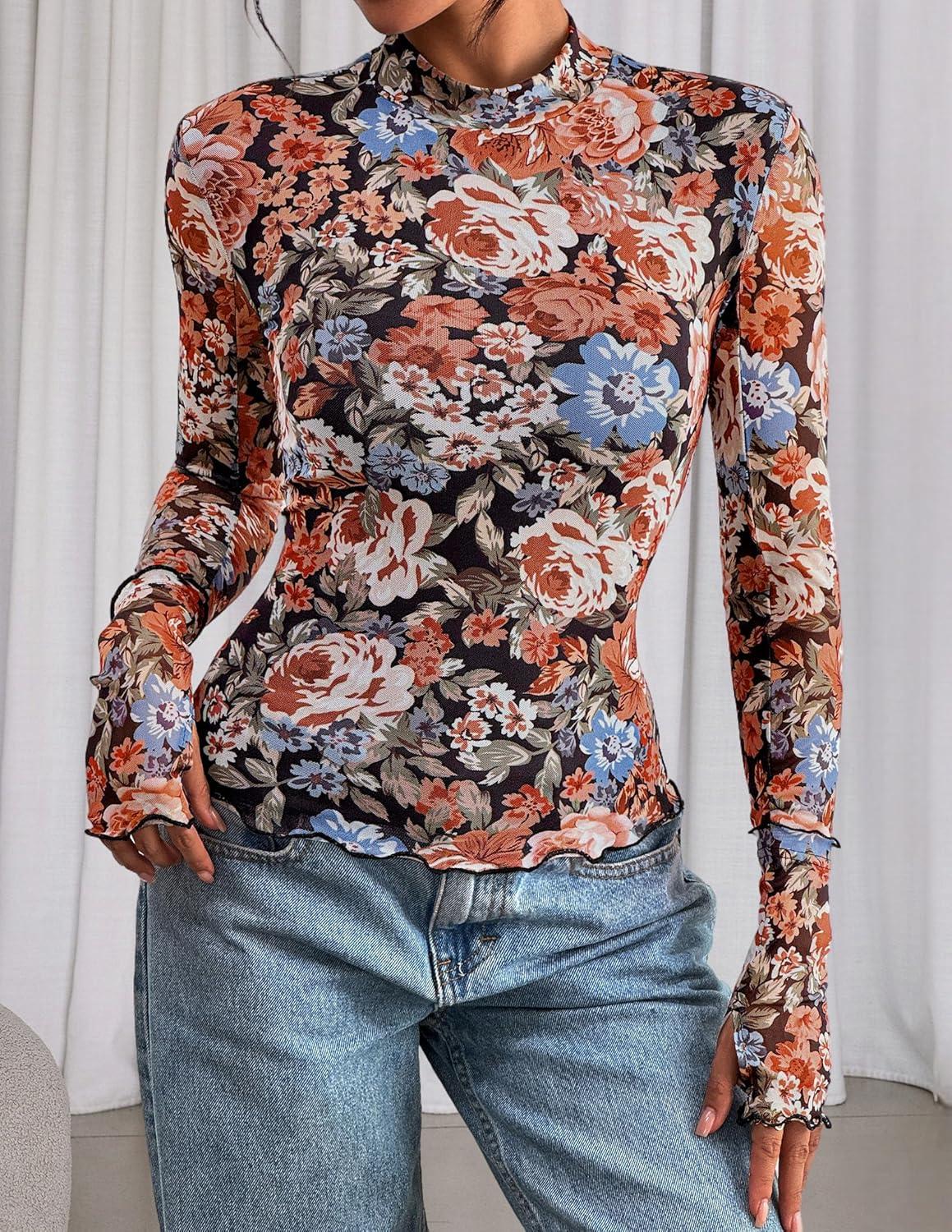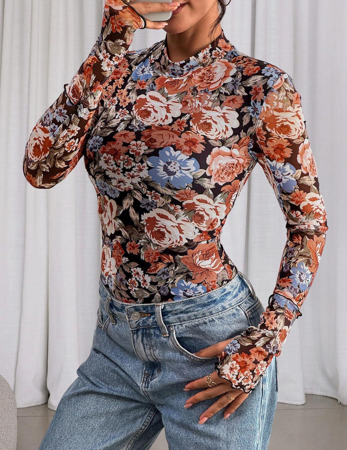 PRETTYGARDEN Womens 2025 Fall Mesh Floral Blouses Long Sleeve Going Out Tops Slim Fitted Shirts Date Night Outfits(Floral Black Orange)