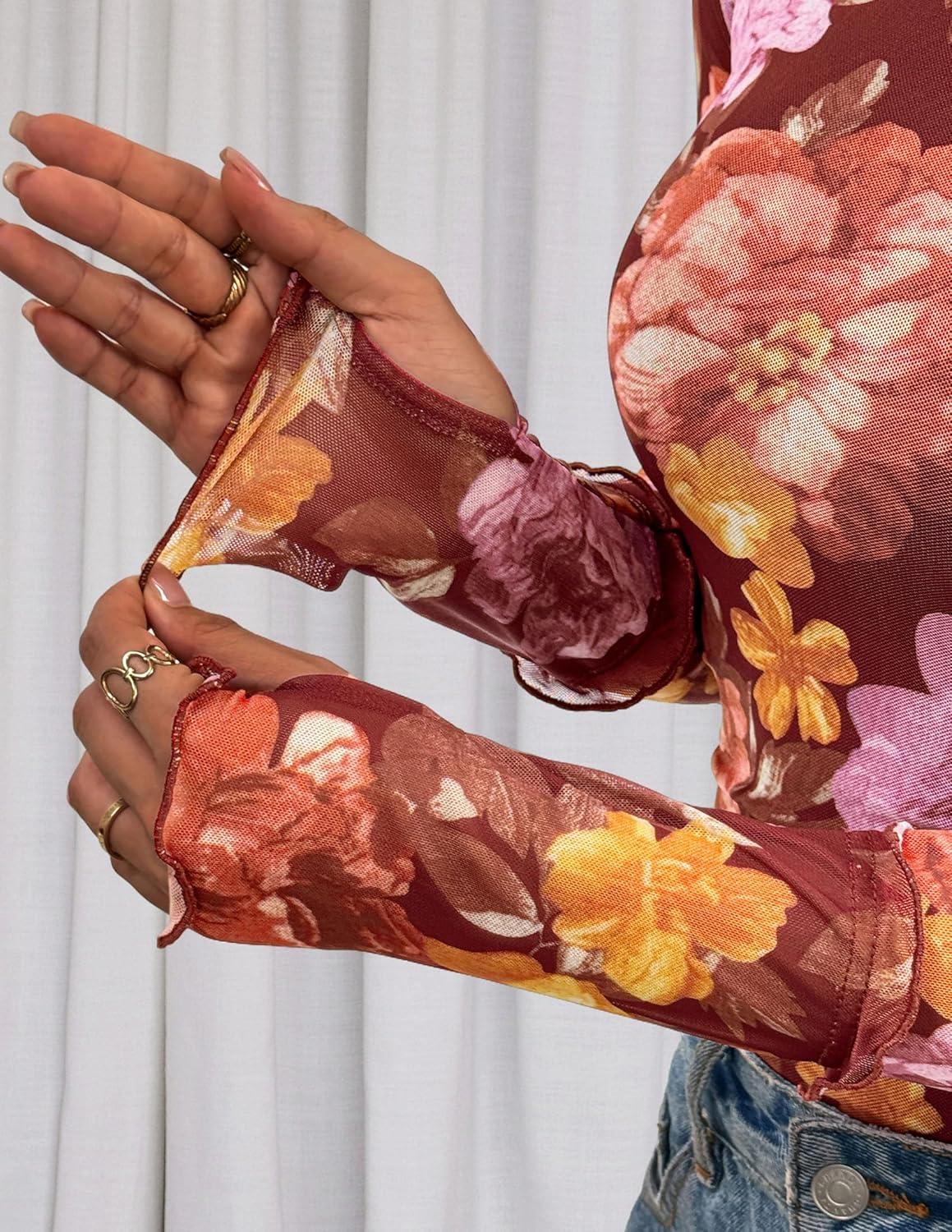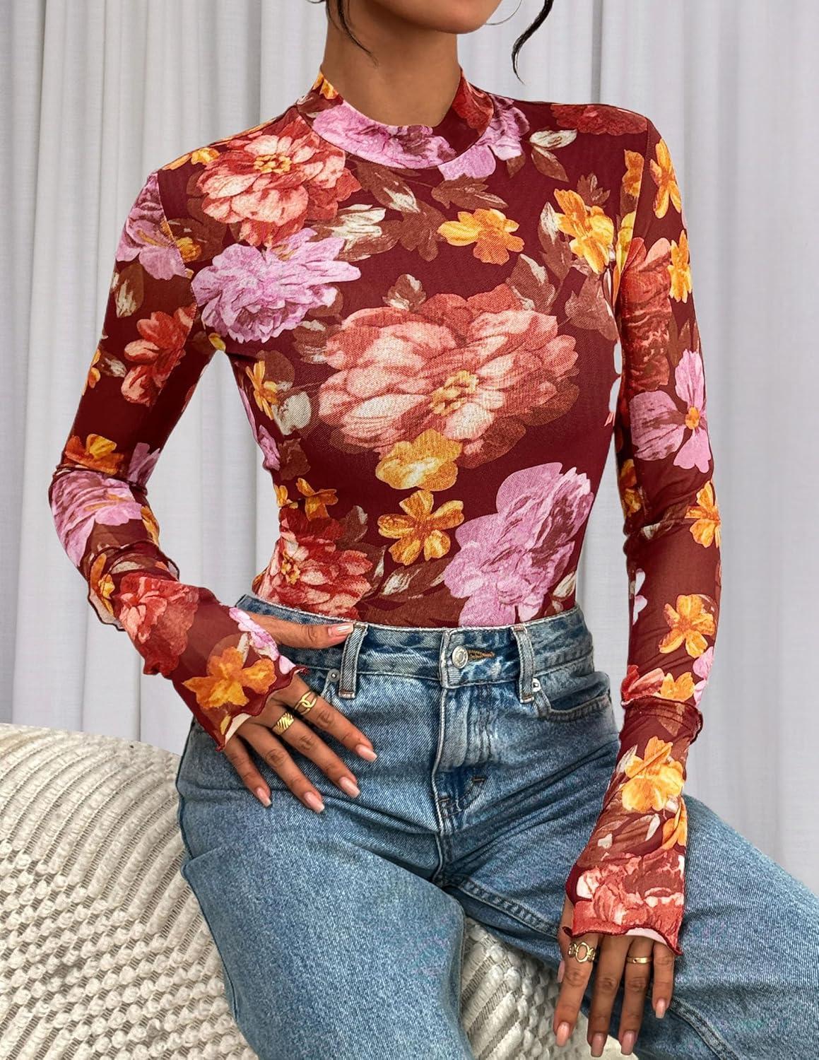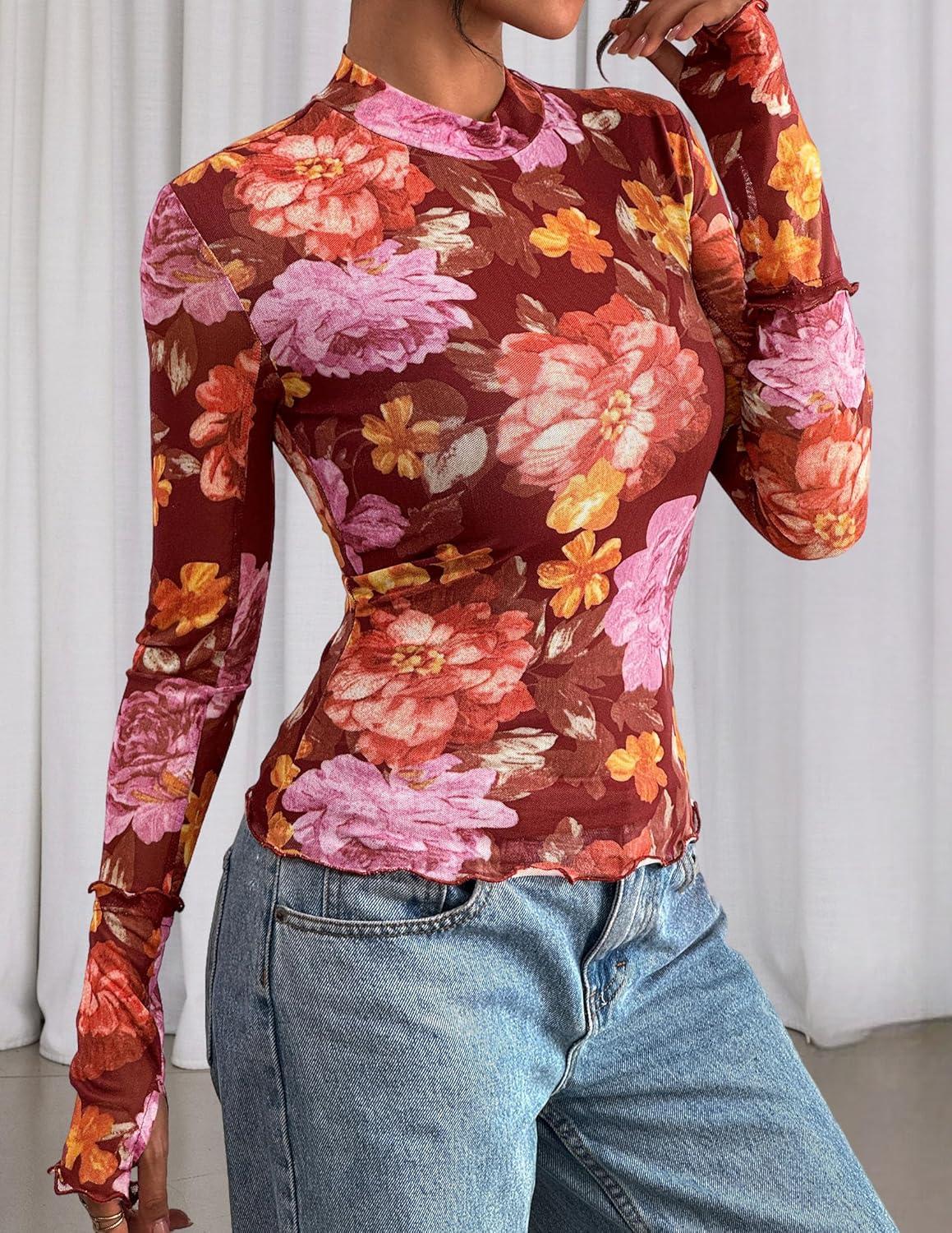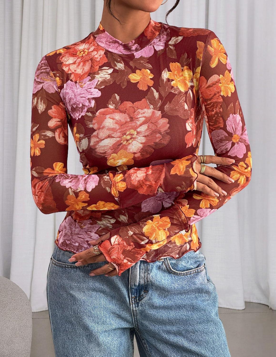 PRETTYGARDEN Womens 2025 Fall Mesh Floral Blouses Long Sleeve Going Out Tops Slim Fitted Shirts Date Night Outfits(Floral Brown Orange)