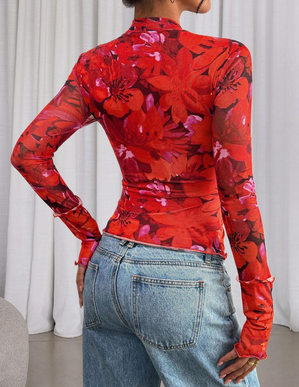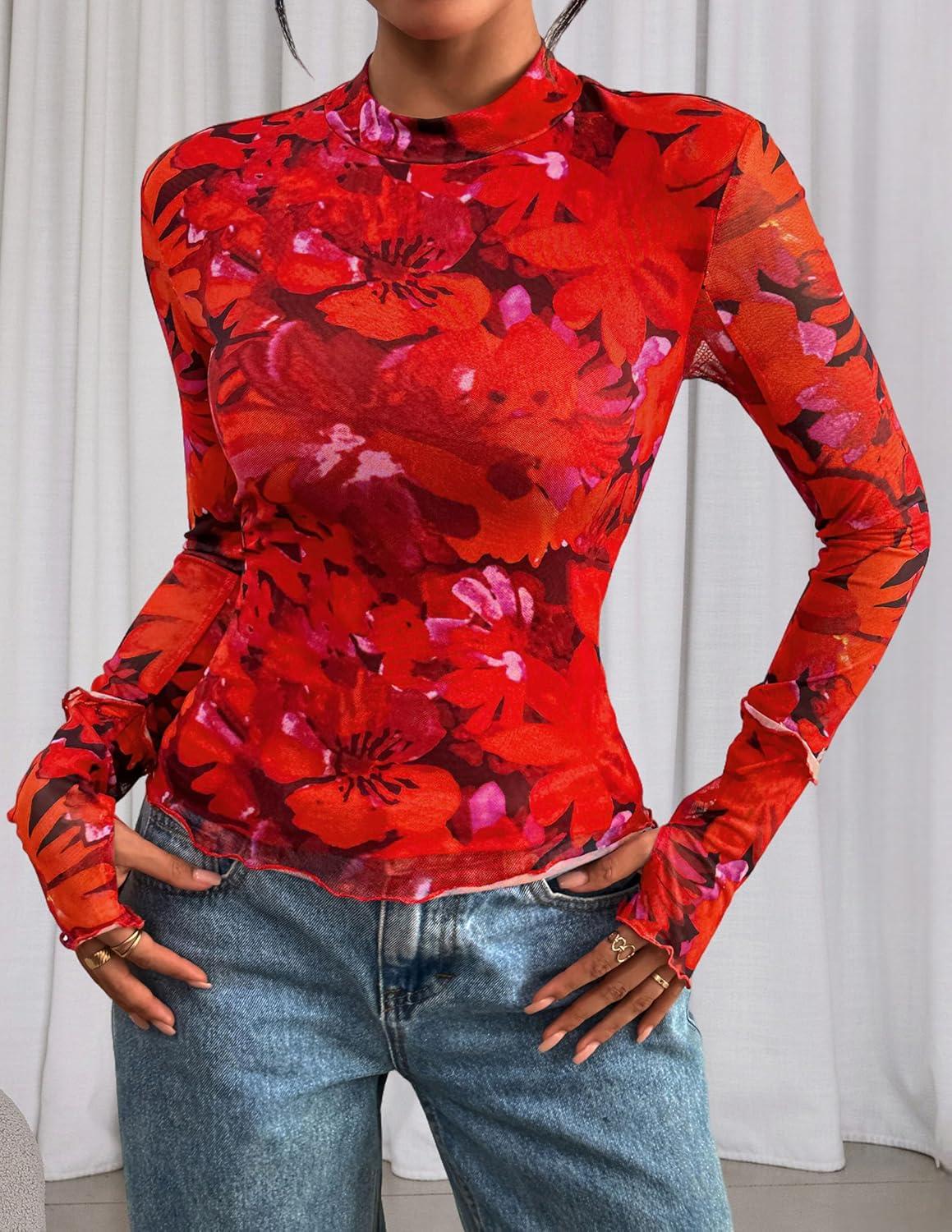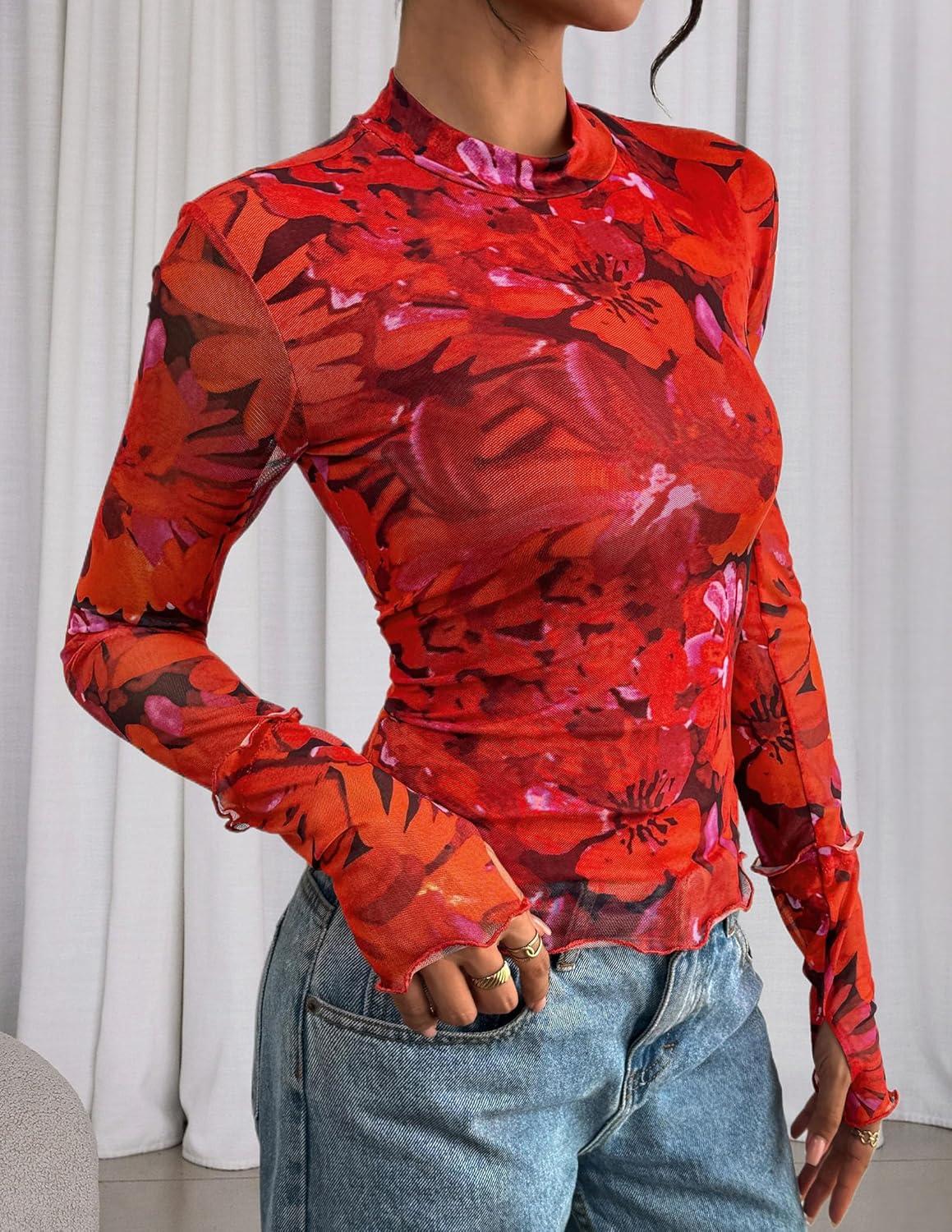 PRETTYGARDEN Womens 2025 Fall Mesh Floral Blouses Long Sleeve Going Out Tops Slim Fitted Shirts Date Night Outfits(Floral Orange Red)