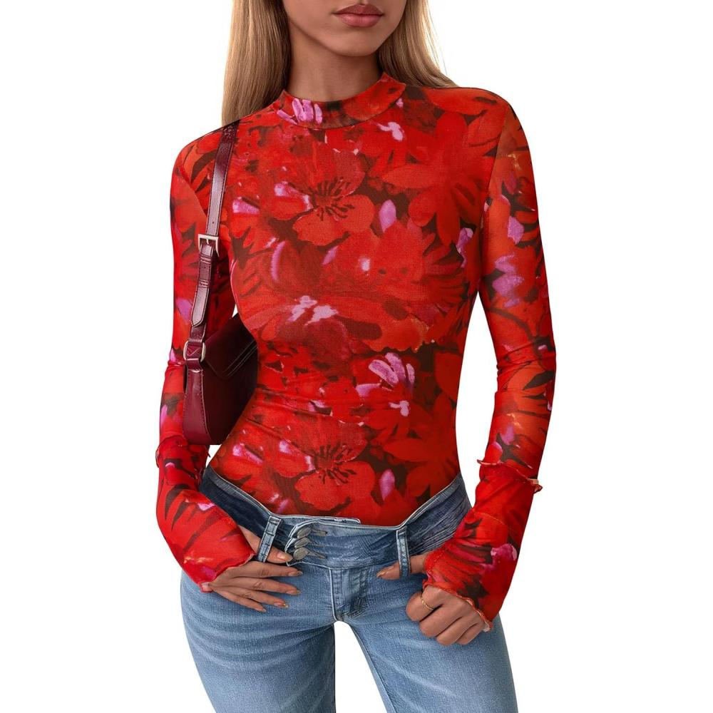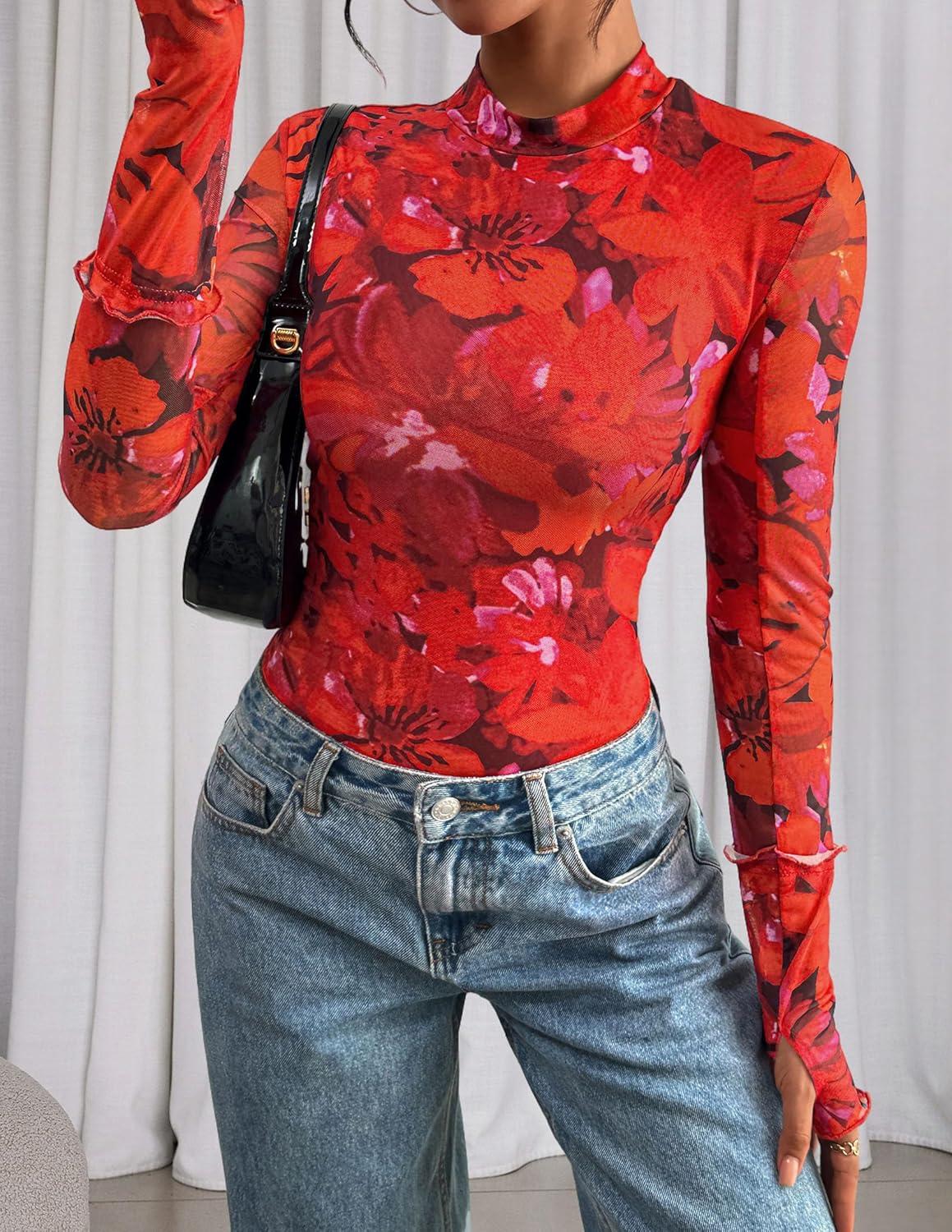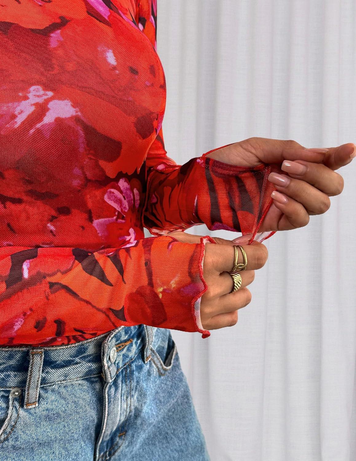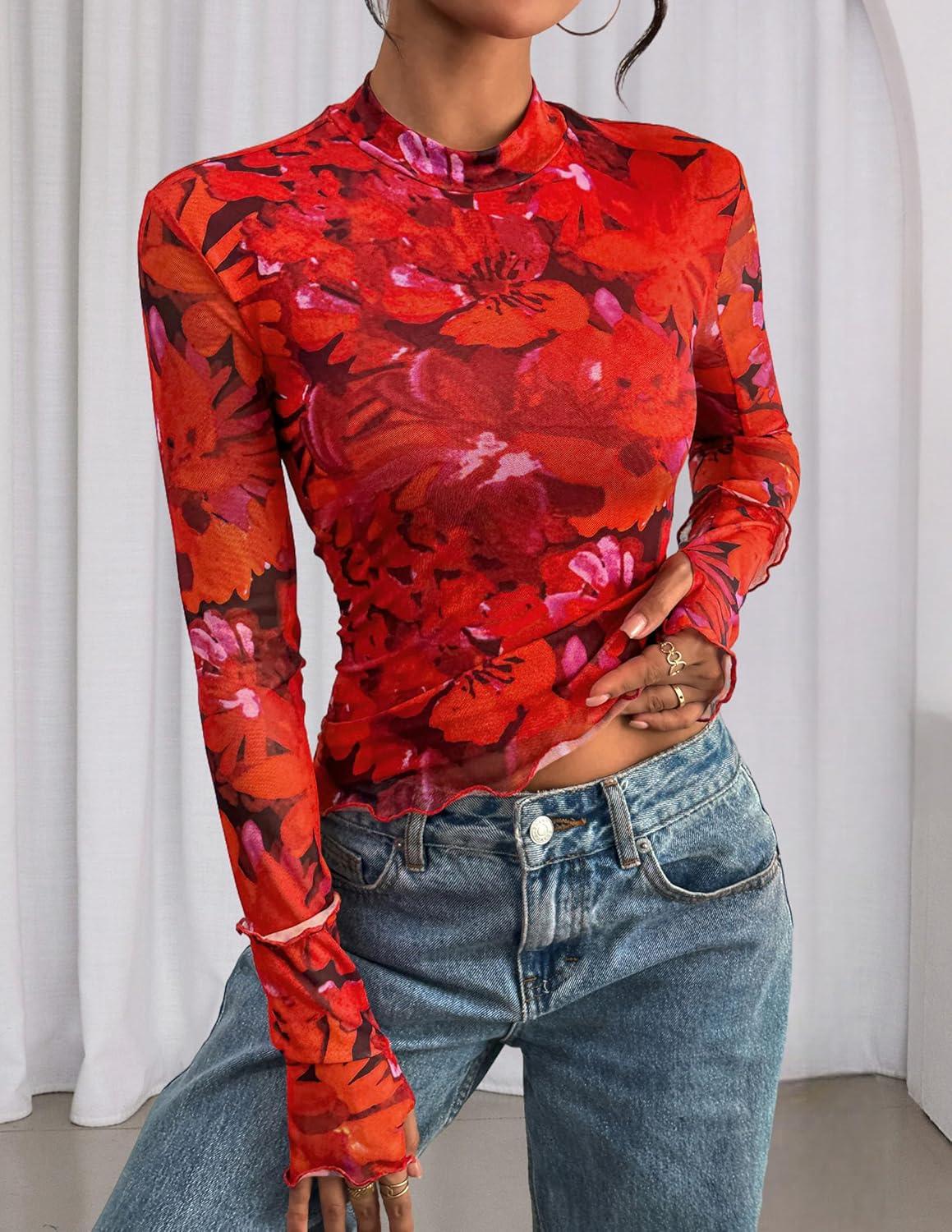 PRETTYGARDEN Womens 2025 Fall Mesh Floral Blouses Long Sleeve Going Out Tops Slim Fitted Shirts Date Night Outfits(Floral Orange Red)