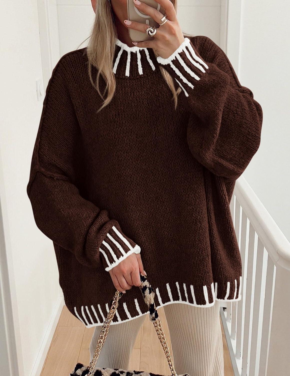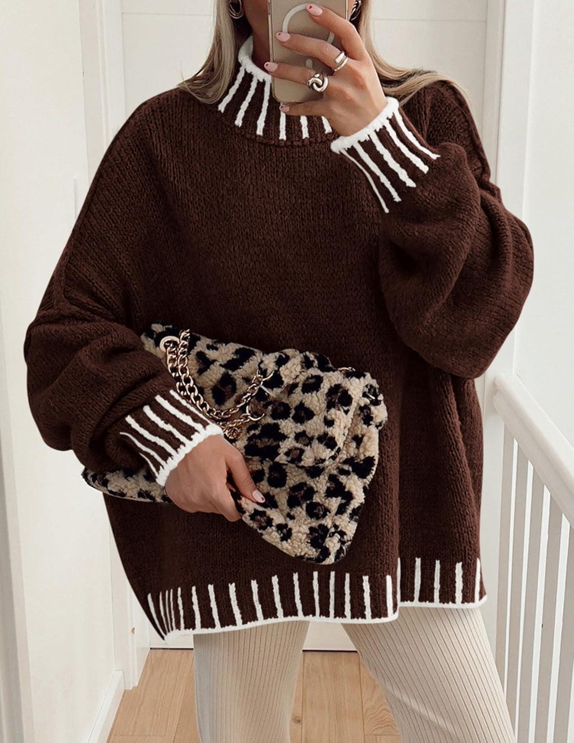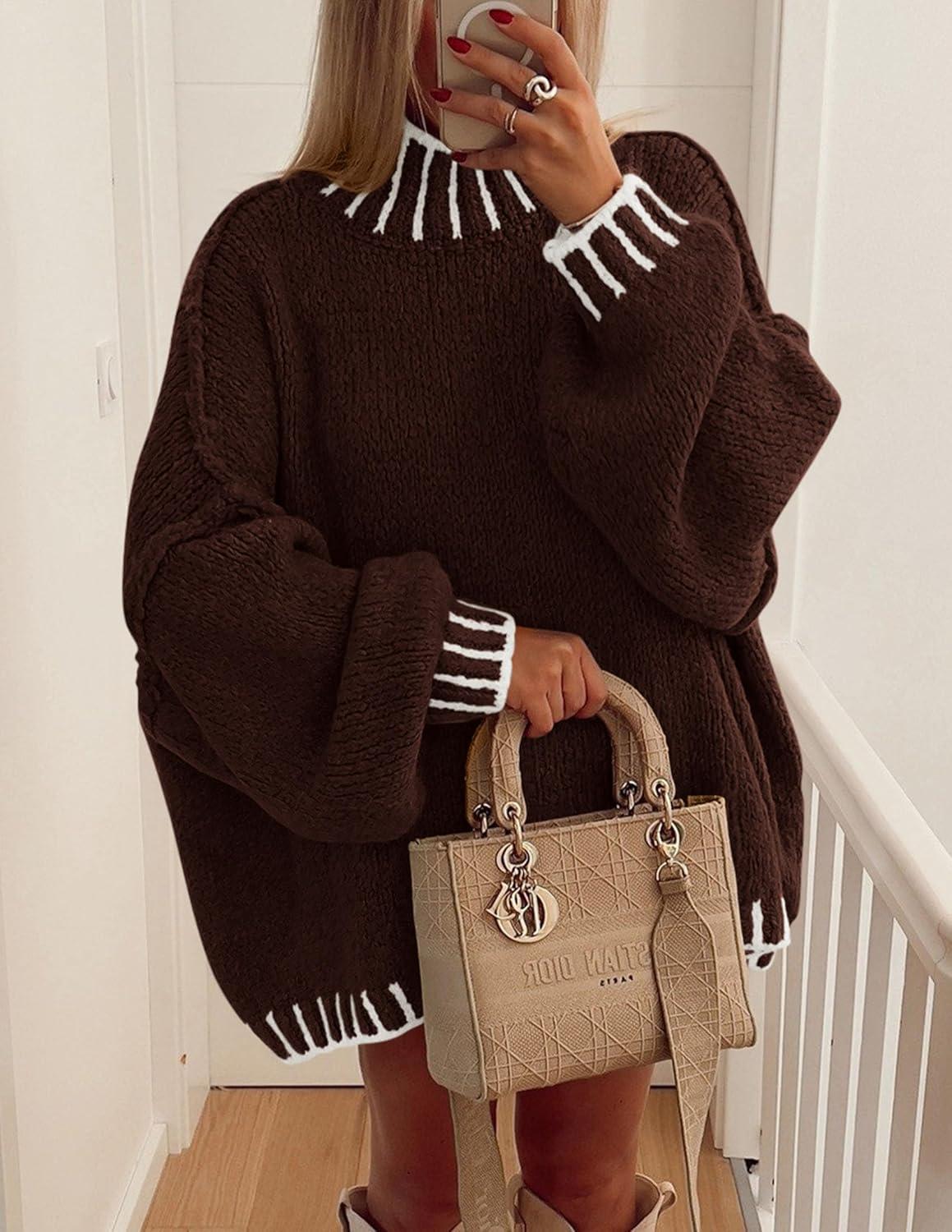 PRETTYGARDEN Women’s 2025 Fall Oversized Pullover Sweaters Long Sleeve Mock Neck Chunky Knit Jumper Tops Winter Clothing(Brown)