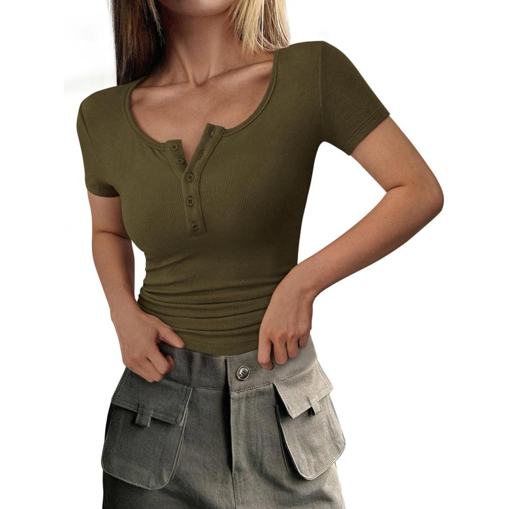 PRETTYGARDEN Women's 2025 Fall Summer Short Sleeve Tops Ribbed Henley Button Slim Fit Basic Casual T Shirts Blouse Clothing(Army Green)
