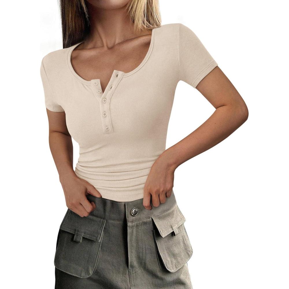 PRETTYGARDEN Women’s 2025 Fall Summer Short Sleeve Tops Ribbed Henley Button Slim Fit Basic Casual T Shirts Blouse Clothing(Beige)