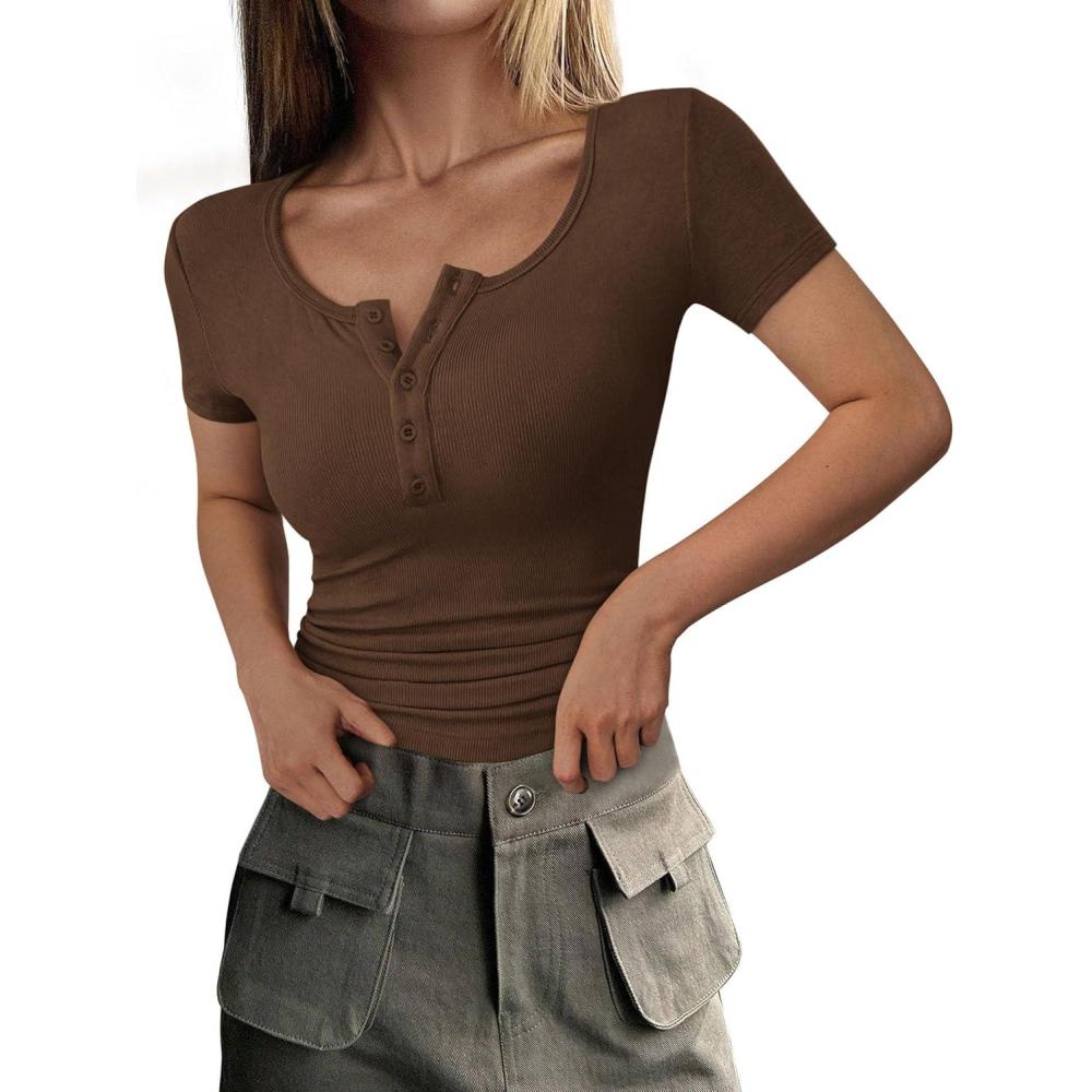 imagePRETTYGARDEN Womens 2025 Fall Summer Short Sleeve Tops Ribbed Henley Button Slim Fit Basic Casual T Shirts Blouse ClothingCoffee