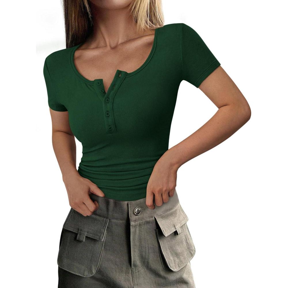 PRETTYGARDEN Women’s 2025 Fall Summer Short Sleeve Tops Ribbed Henley Button Slim Fit Basic Casual T Shirts Blouse Clothing(Dark Green)