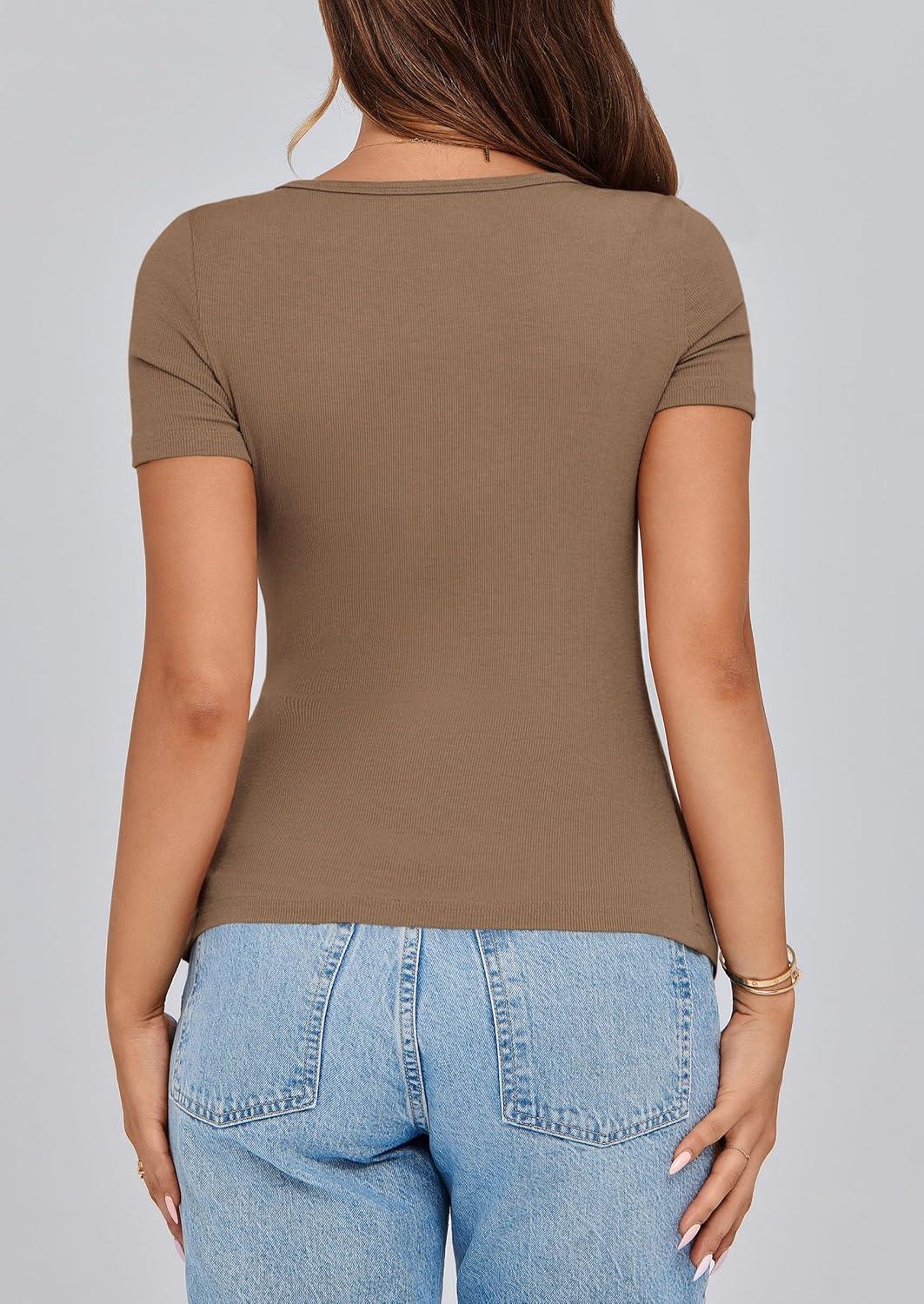 imagePRETTYGARDEN Womens 2025 Fall Summer Short Sleeve Tops Ribbed Henley Button Slim Fit Basic Casual T Shirts Blouse ClothingLight Brown