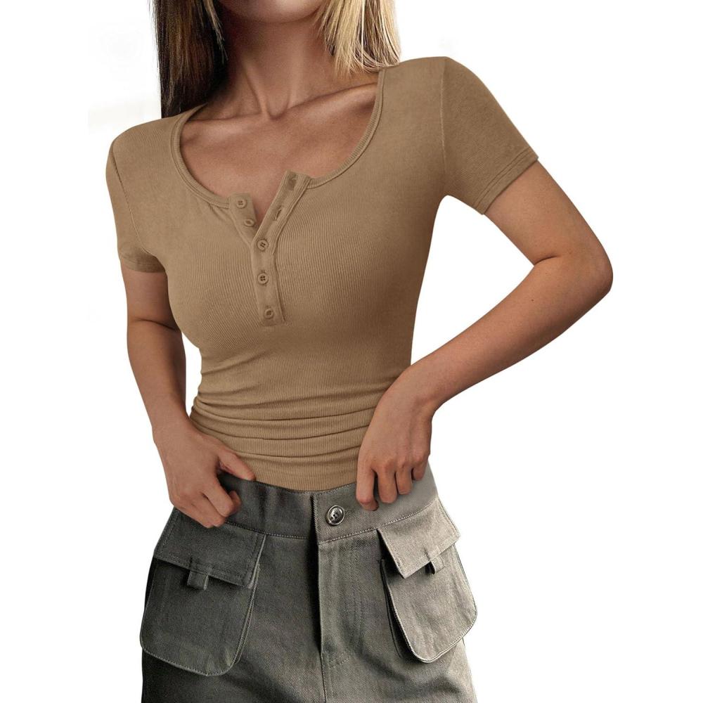 PRETTYGARDEN Women's 2025 Fall Summer Short Sleeve Tops Ribbed Henley Button Slim Fit Basic Casual T Shirts Blouse Clothing(Light Khaki)