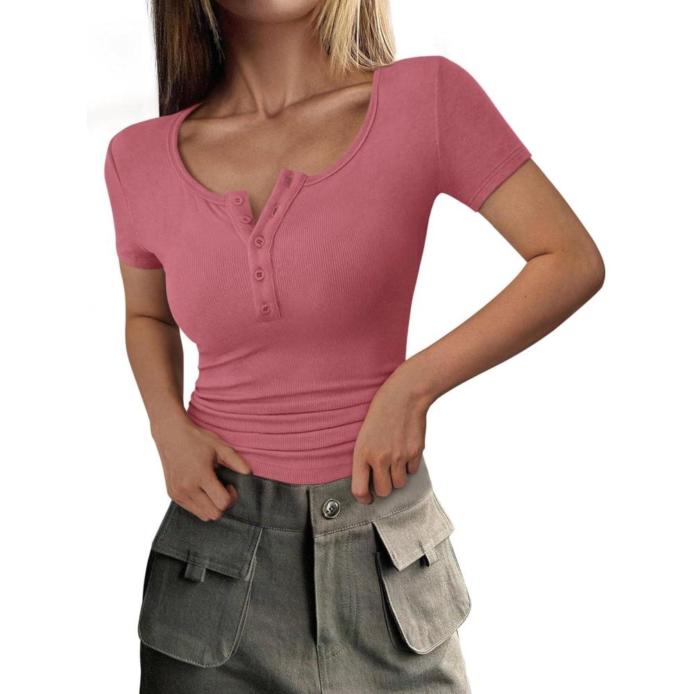 PRETTYGARDEN Women's 2025 Fall Summer Short Sleeve Tops Ribbed Henley Button Slim Fit Basic Casual T Shirts Blouse Clothing(Rose Pink)