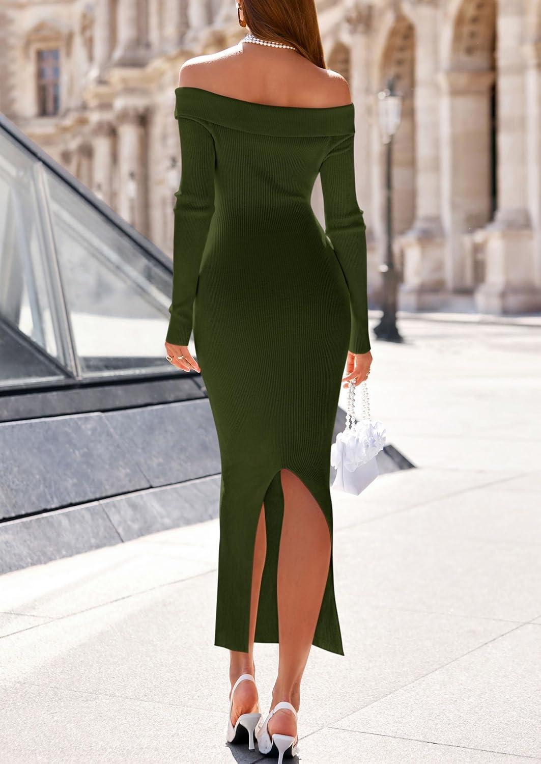 PRETTYGARDEN Women's 2025 Fall Sweater Dress Long Sleeve Off Shoulder Slit Maxi Bodycon Cocktail Party Dresses(Army Green)