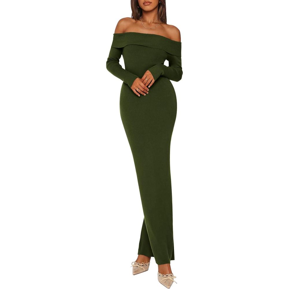 PRETTYGARDEN Women’s 2025 Fall Sweater Dress Long Sleeve Off Shoulder Slit Maxi Bodycon Cocktail Party Dresses(Army Green)