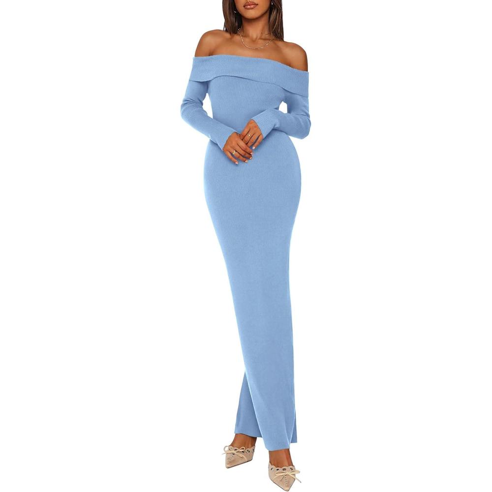 PRETTYGARDEN Women's 2025 Fall Sweater Dress Long Sleeve Off Shoulder Slit Maxi Bodycon Cocktail Party Dresses(Light Blue)
