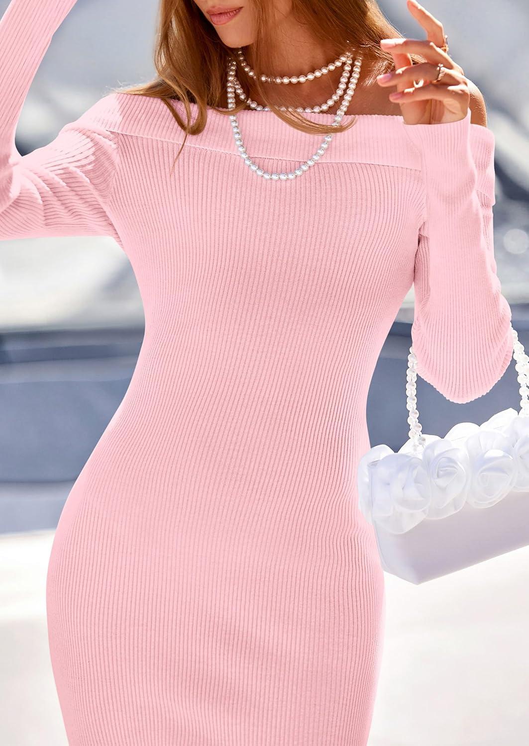 PRETTYGARDEN Women's 2025 Fall Sweater Dress Long Sleeve Off Shoulder Slit Maxi Bodycon Cocktail Party Dresses(Light Pink)