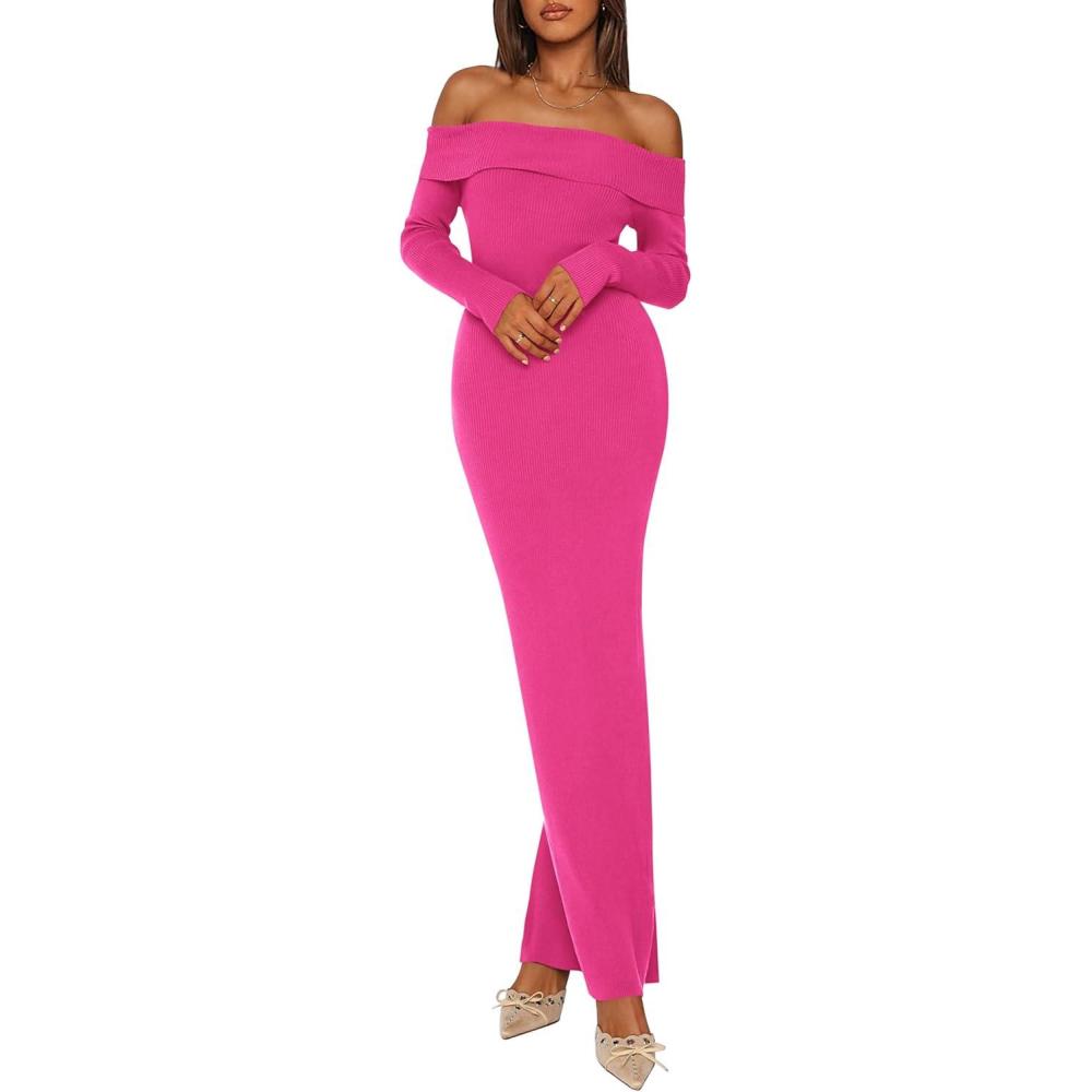 PRETTYGARDEN Women's 2025 Fall Sweater Dress Long Sleeve Off Shoulder Slit Maxi Bodycon Cocktail Party Dresses(Rose Red)