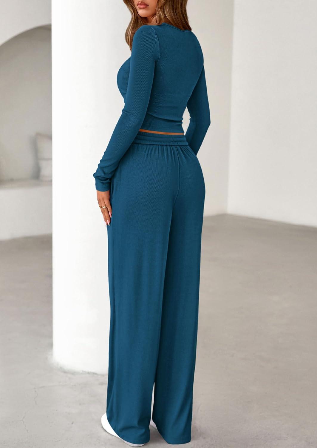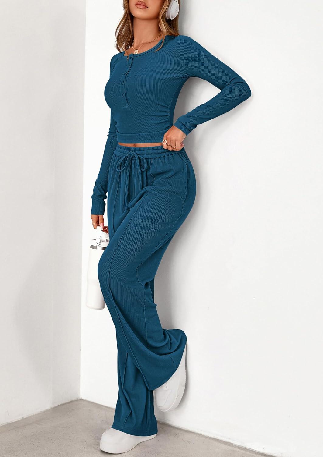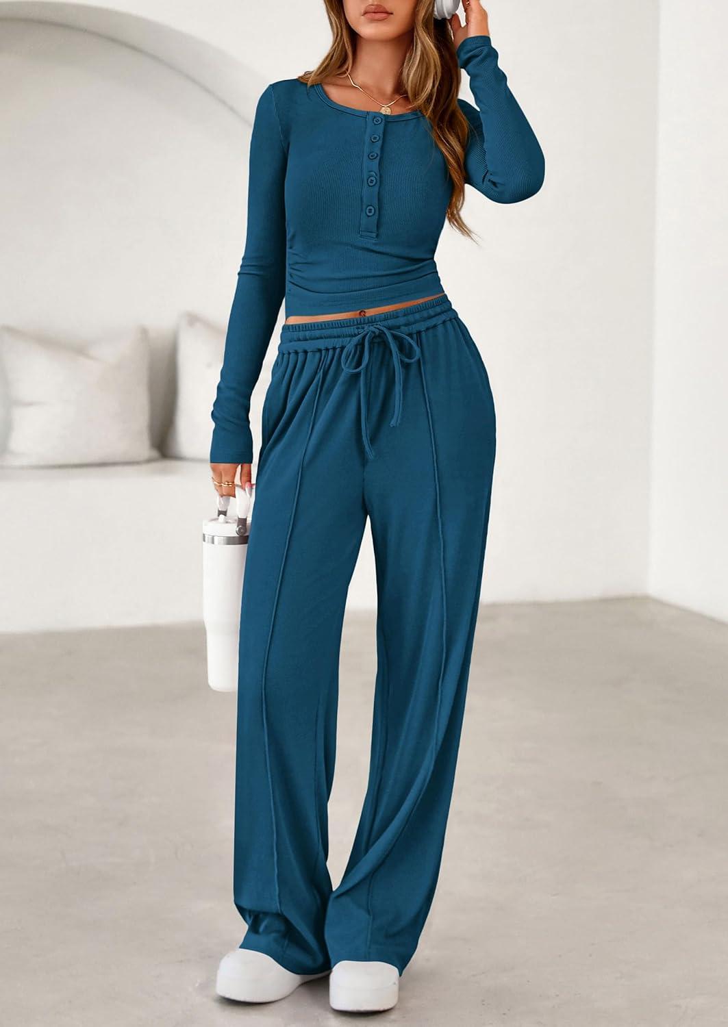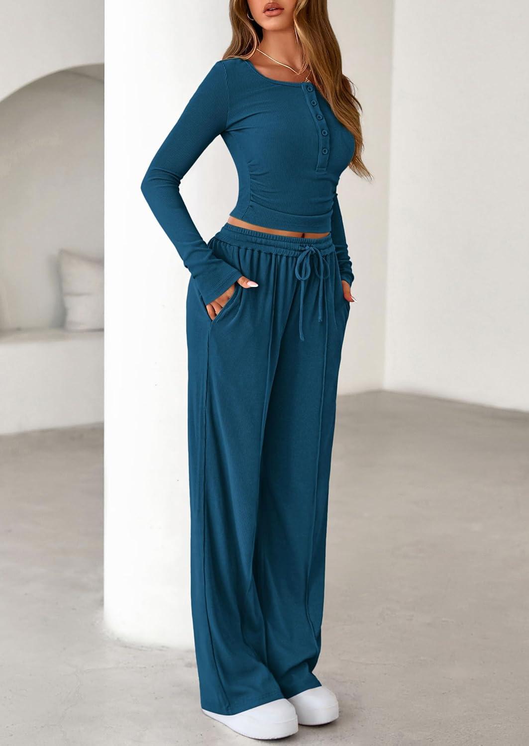 PRETTYGARDEN Women’s 2025 Fall Trendy 2 Piece Outfits Lounge Sets Long Sleeve Top Henley Shirts Wide Leg Pants Travel Clothes(Dark Blue)