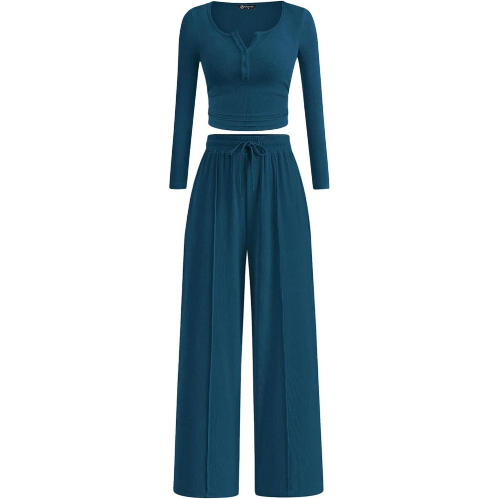 PRETTYGARDEN Women's 2025 Fall Trendy 2 Piece Outfits Lounge Sets Long Sleeve Top Henley Shirts Wide Leg Pants Travel Clothes(Dark Blue)