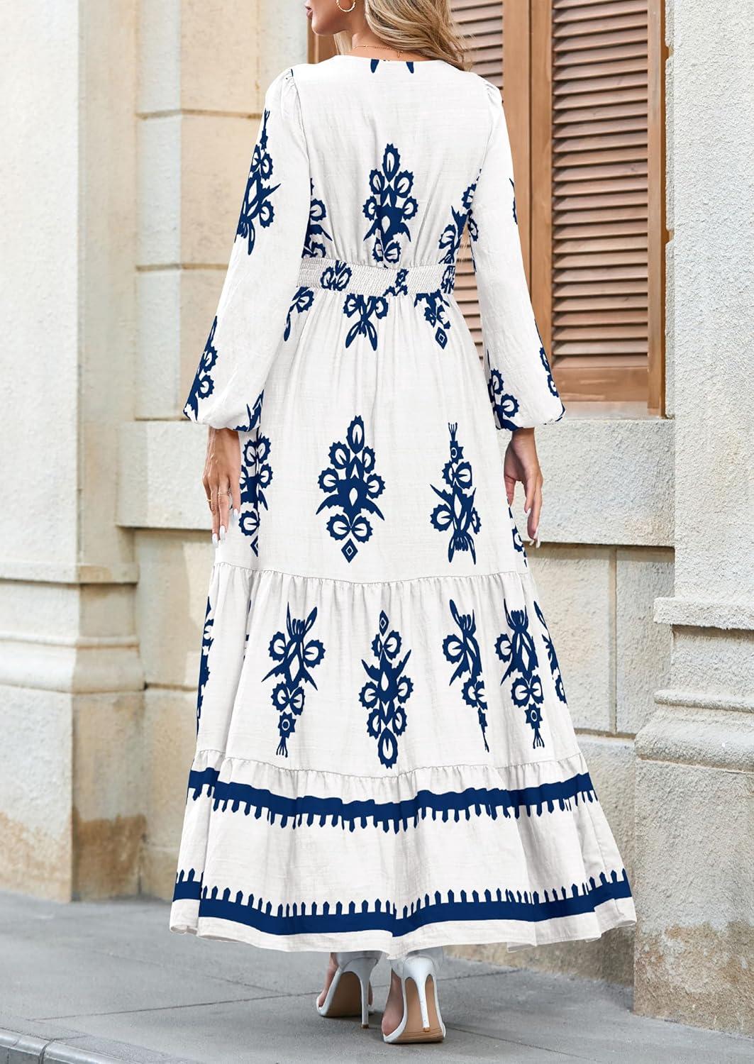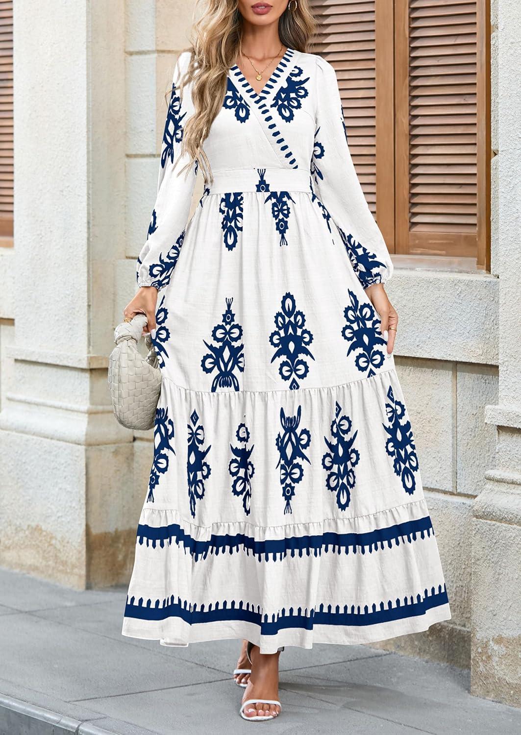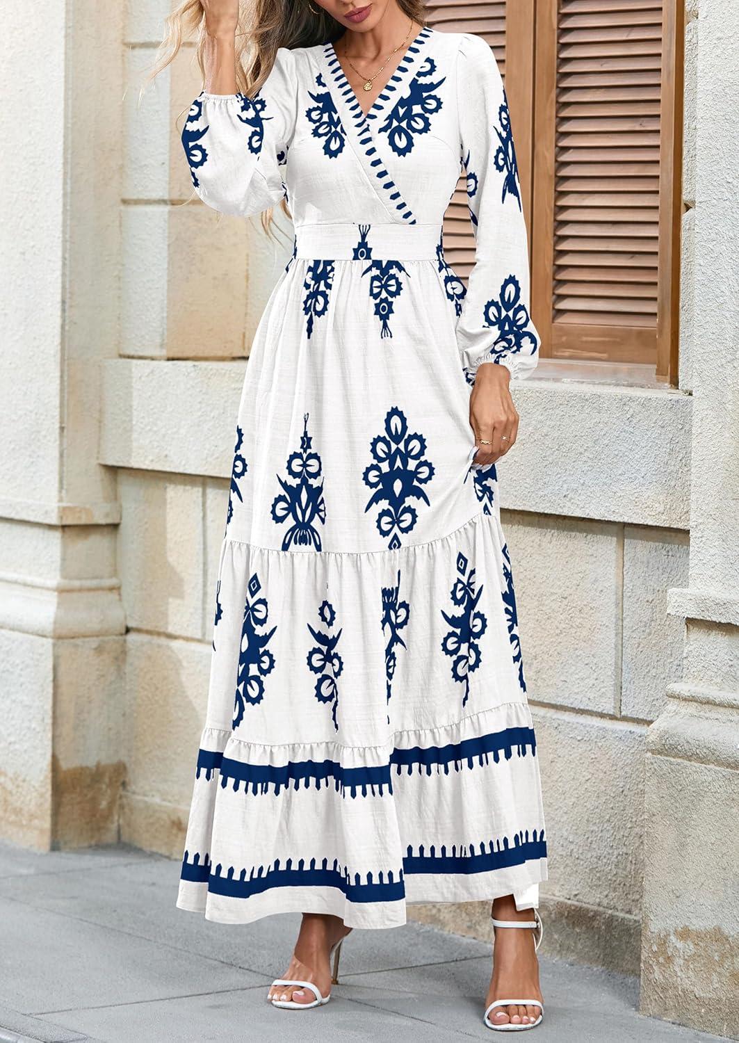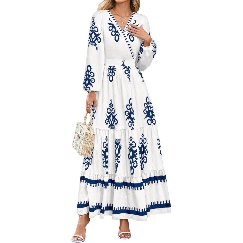 PRETTYGARDEN Women's 2025 Fall Wedding Guest Dresses Boho Floral Long Sleeve V Neck Flowy Elegant Maxi Dress Beach Clothes(Floral White Blue)