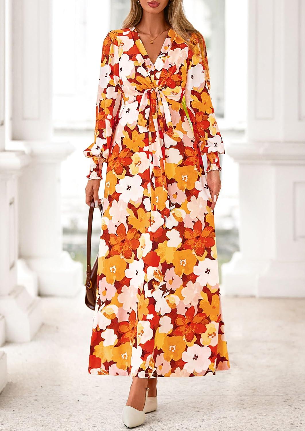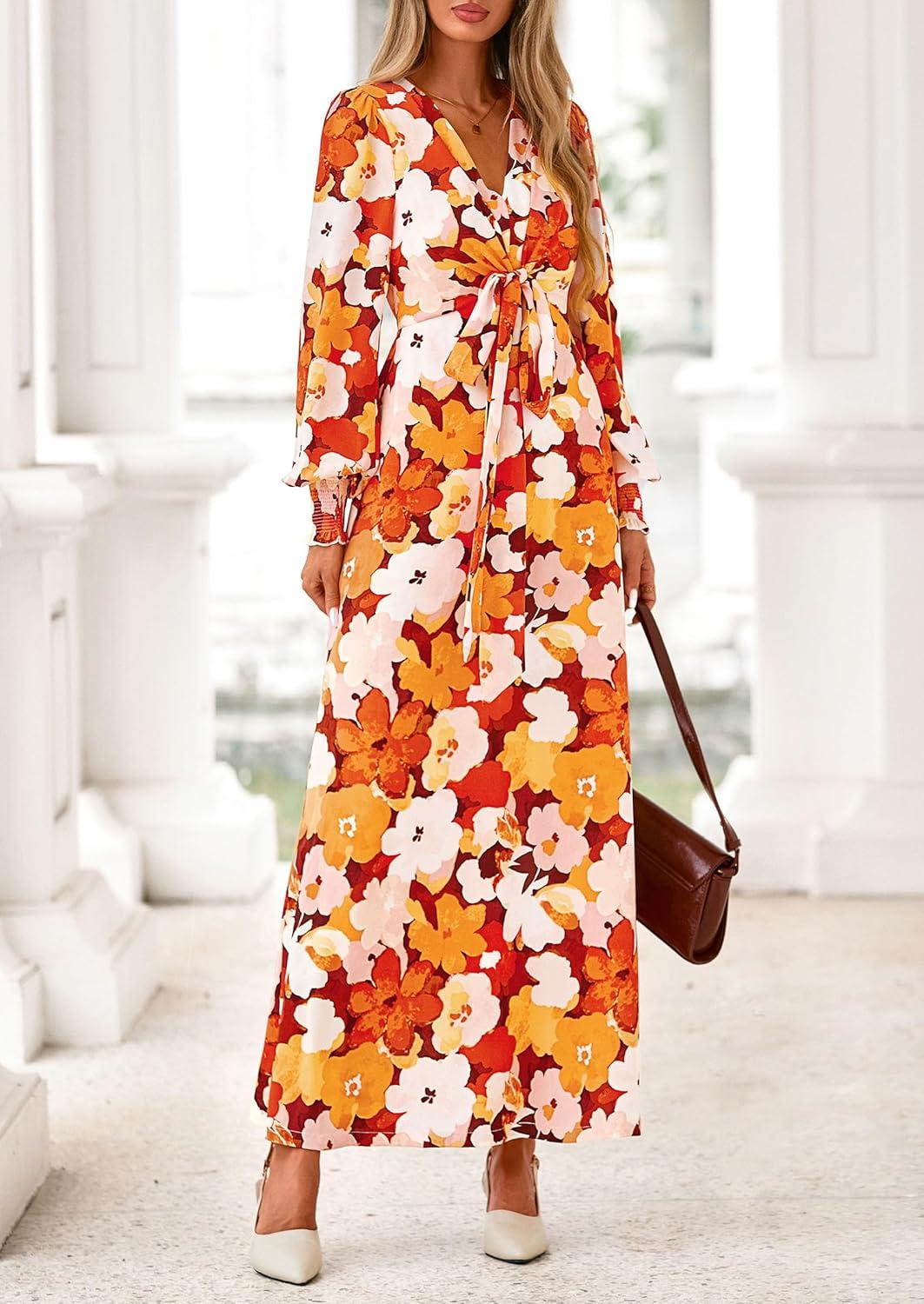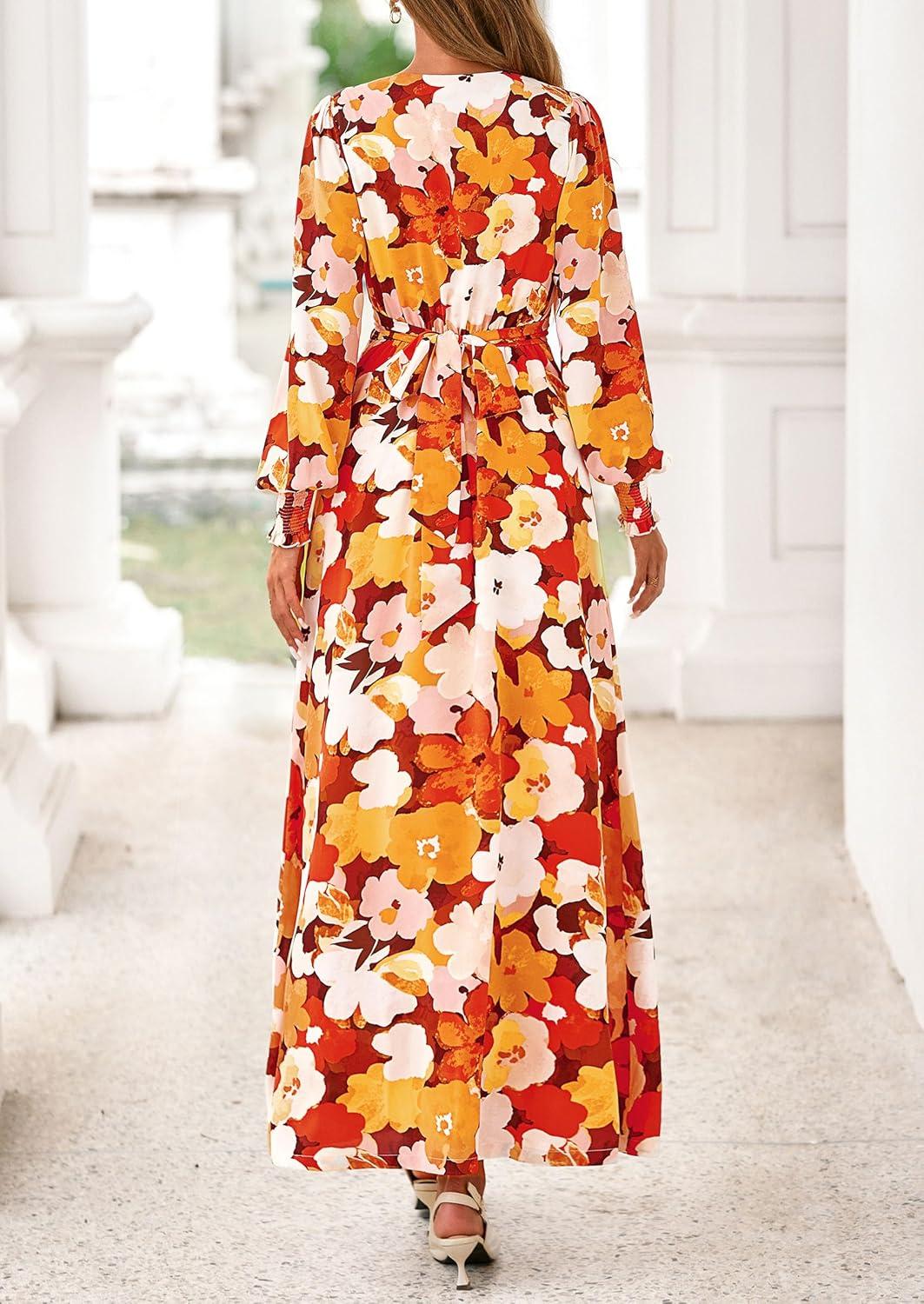 PRETTYGARDEN Women’s 2025 Fall Wedding Guest Dresses Floral Long Sleeve V Neck Belted Long Flowy Boho Maxi Dress(Floral Orange)