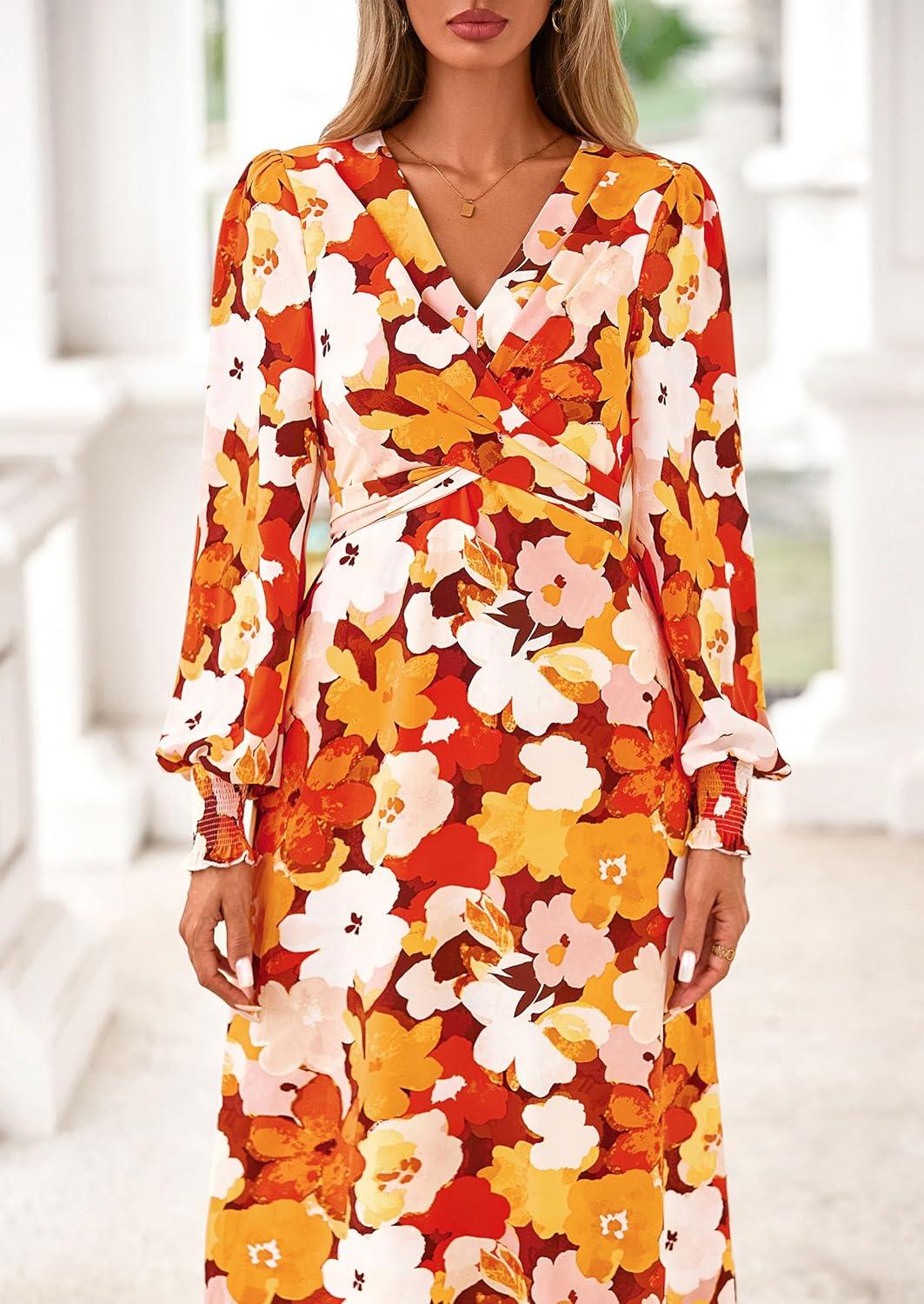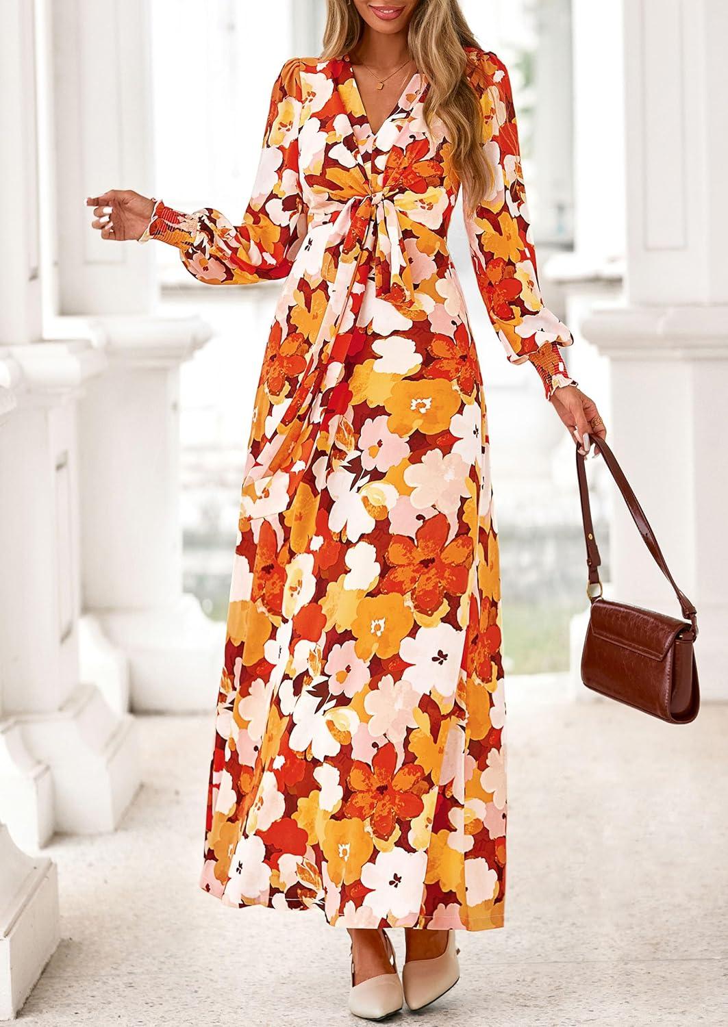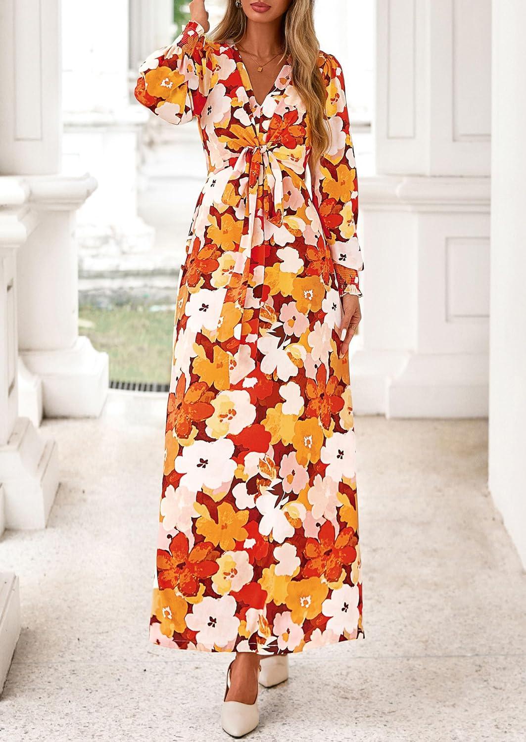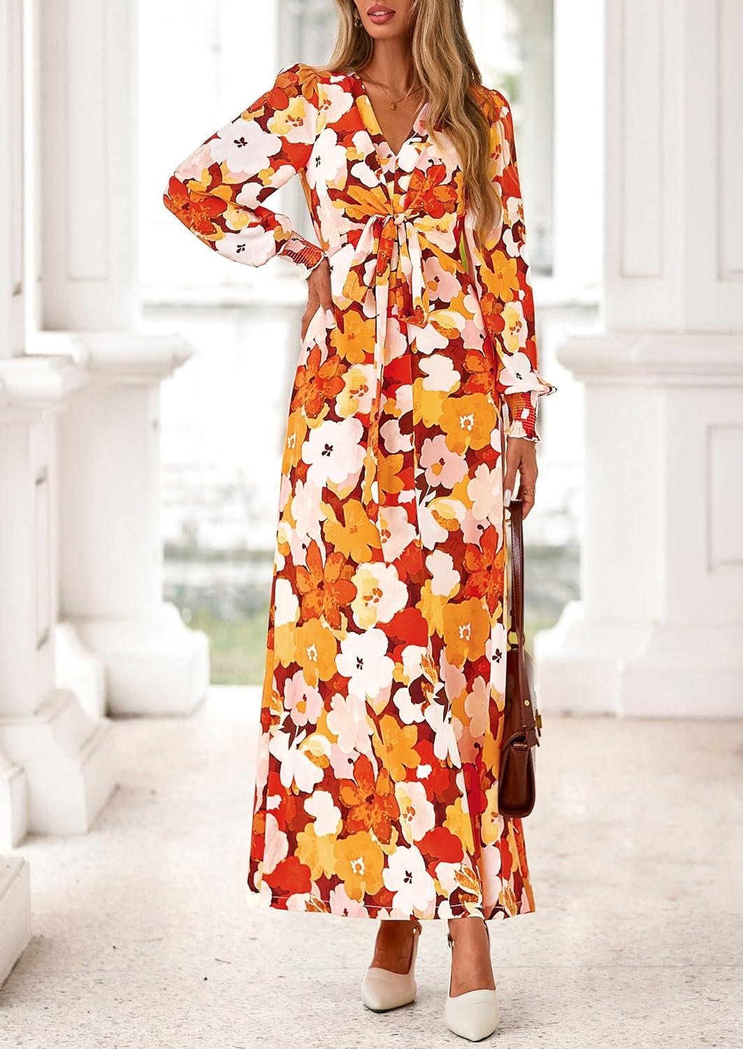 PRETTYGARDEN Women’s 2025 Fall Wedding Guest Dresses Floral Long Sleeve V Neck Belted Long Flowy Boho Maxi Dress(Floral Orange)