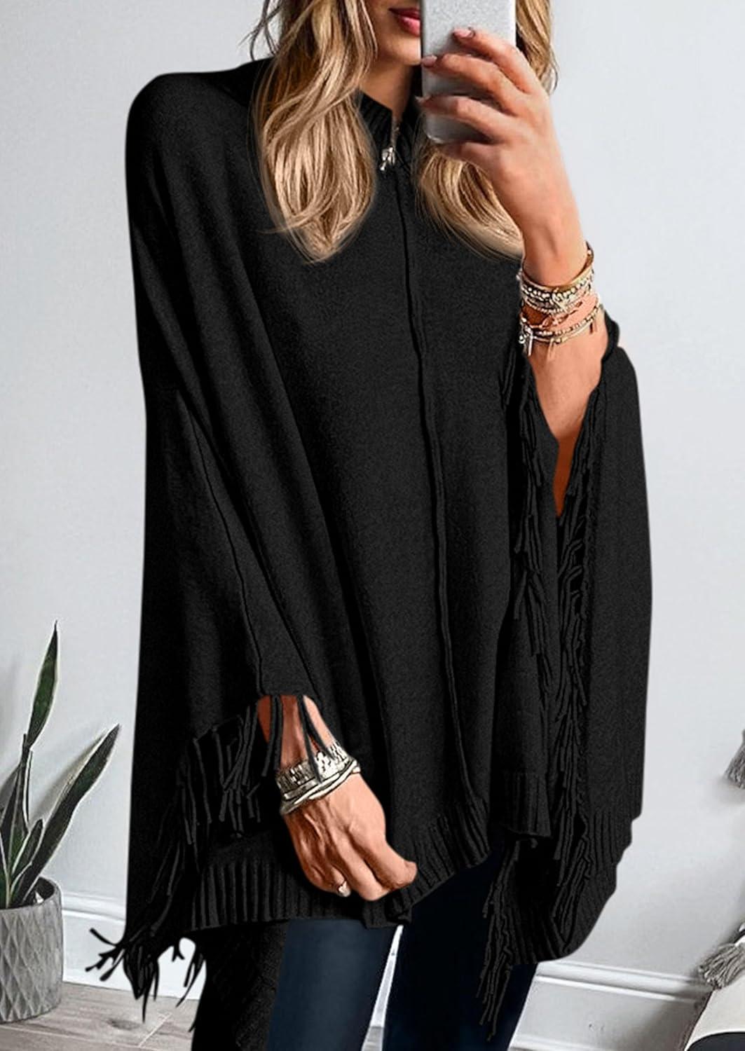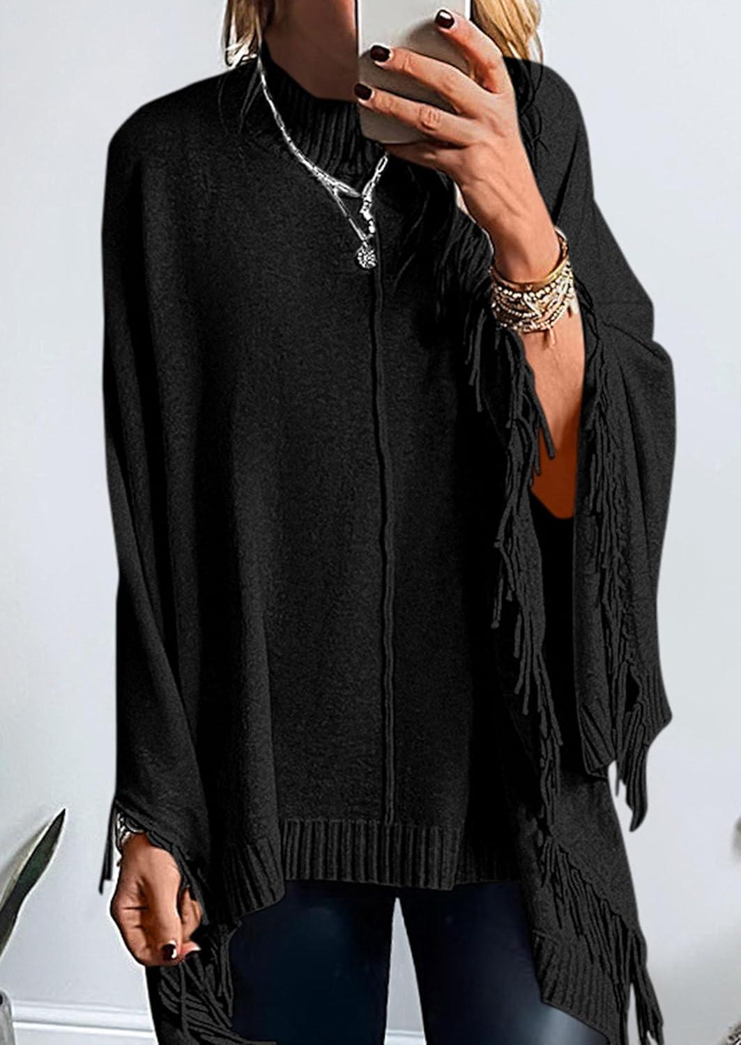 imagePRETTYGARDEN Womens 2025 Fall Winter Poncho Sweaters Trendy Chunky Knit Fringe Shawls Wraps Pullover Tops Holiday OutfitsBlack