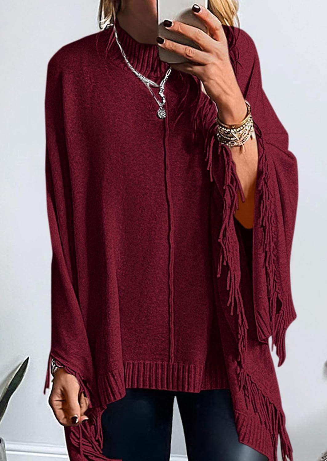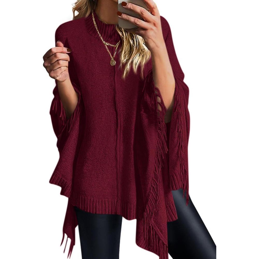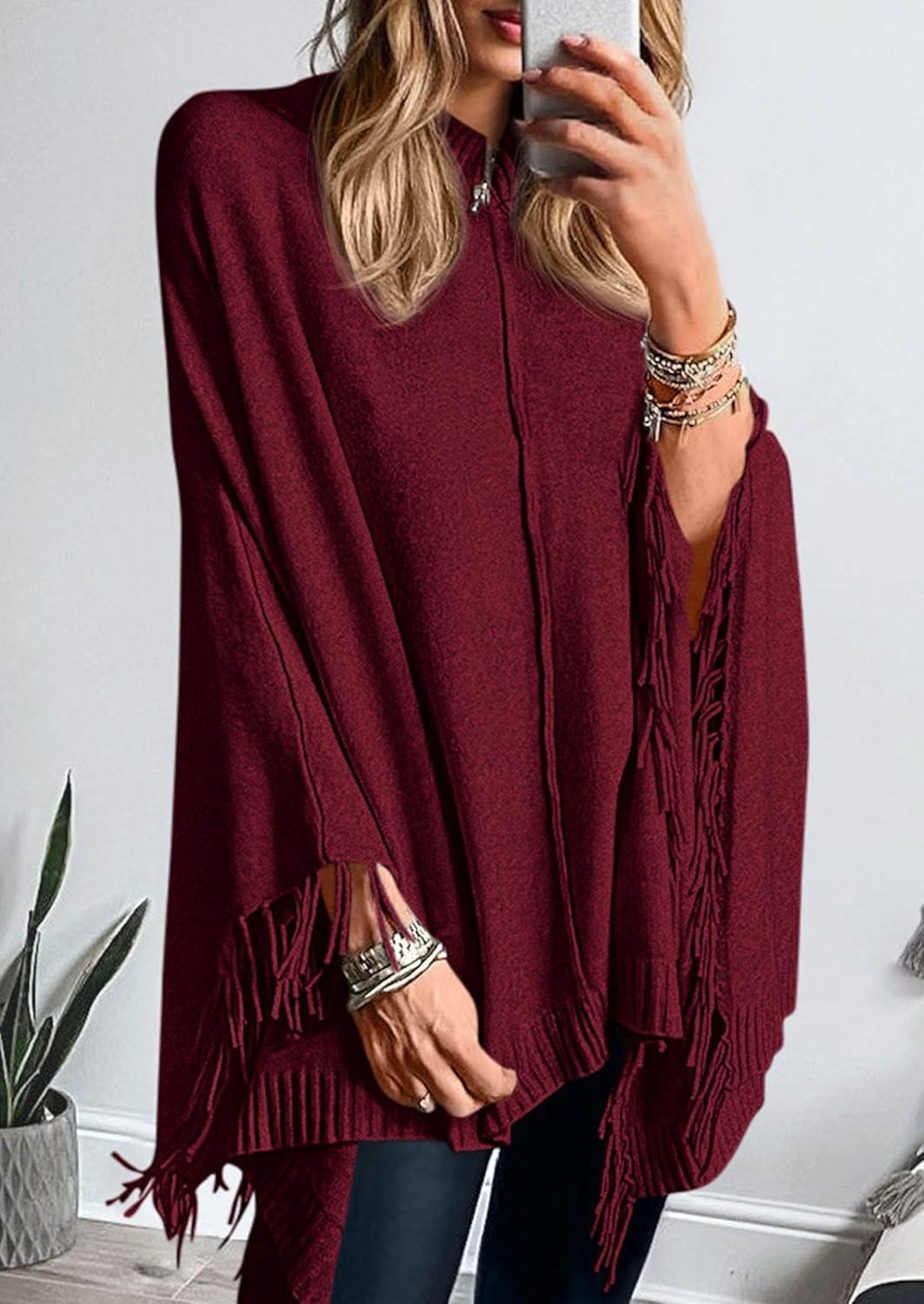 imagePRETTYGARDEN Womens 2025 Fall Winter Poncho Sweaters Trendy Chunky Knit Fringe Shawls Wraps Pullover Tops Holiday OutfitsBurgundy