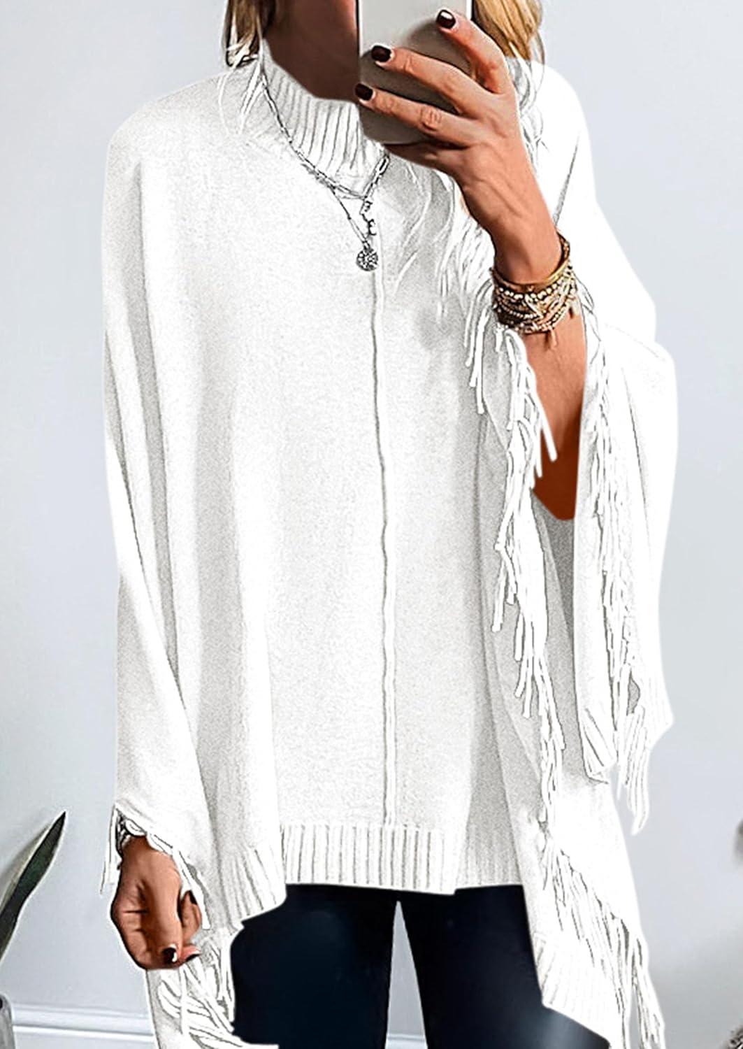 PRETTYGARDEN Women's 2025 Fall Winter Poncho Sweaters Trendy Chunky Knit Fringe Shawls Wraps Pullover Tops Holiday Outfits(White)