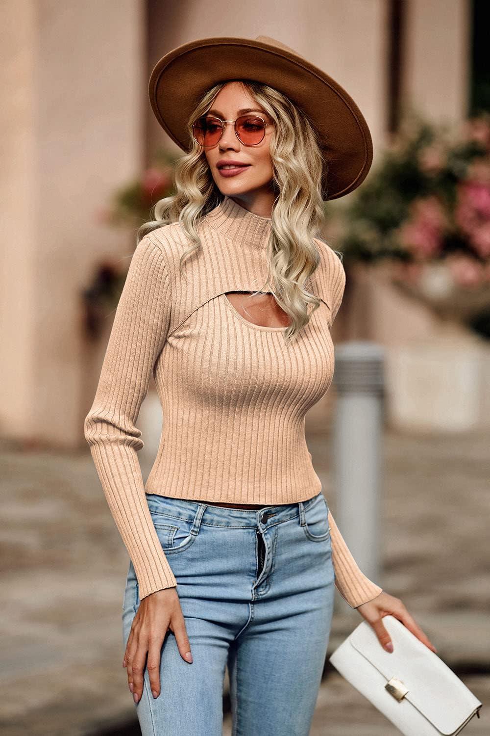 PRETTYGARDEN Women’s 2025 Fashion Fall Clothes 2 Piece Cutout Tops Long Sleeve Mock Neck Rib Knit Winter Pullover Sweater(Apricot)