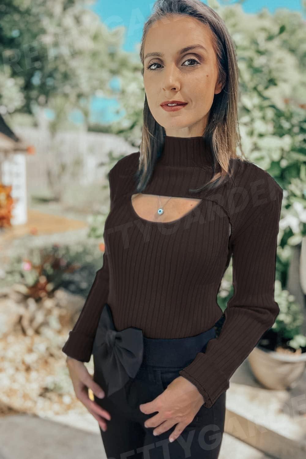 PRETTYGARDEN Women’s 2025 Fashion Fall Clothes 2 Piece Cutout Tops Long Sleeve Mock Neck Rib Knit Winter Pullover Sweater(Brown)