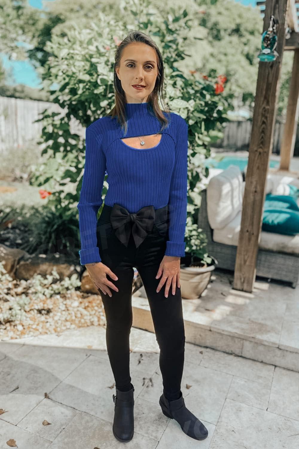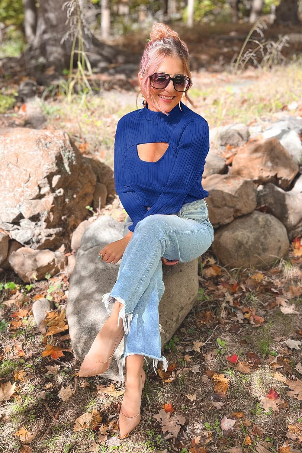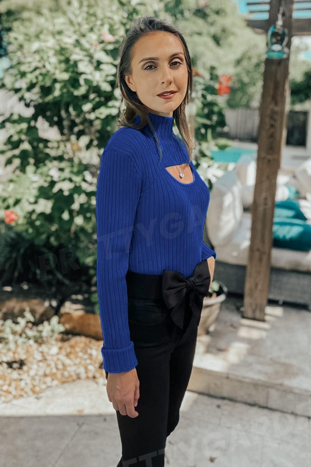 PRETTYGARDEN Women's 2025 Fashion Fall Clothes 2 Piece Cutout Tops Long Sleeve Mock Neck Rib Knit Winter Pullover Sweater(Dark Royal Blue)