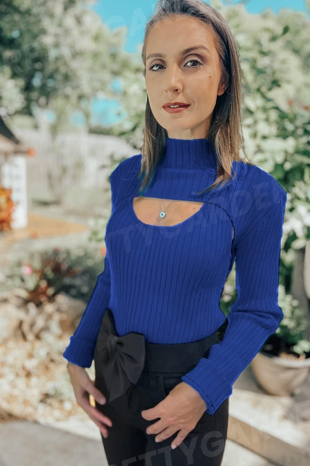 PRETTYGARDEN Women’s 2025 Fashion Fall Clothes 2 Piece Cutout Tops Long Sleeve Mock Neck Rib Knit Winter Pullover Sweater(Dark Royal Blue)