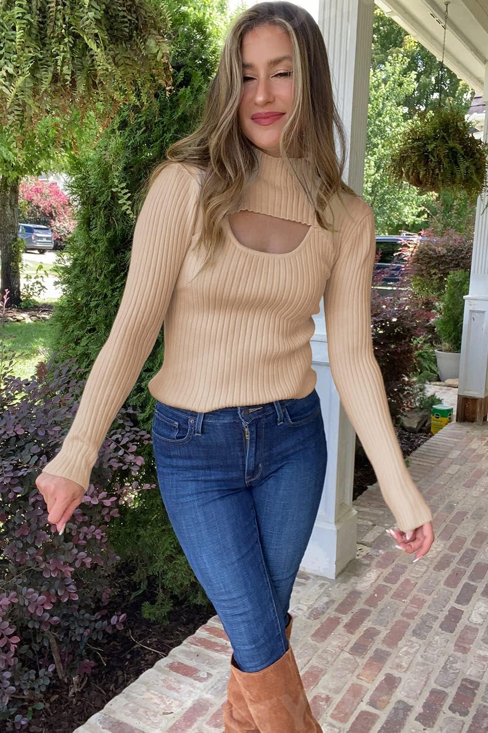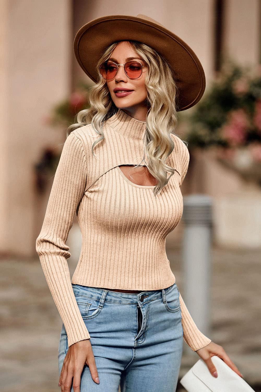 PRETTYGARDEN Women’s 2025 Fashion Fall Clothes 2 Piece Cutout Tops Long Sleeve Mock Neck Rib Knit Winter Pullover Sweater(Apricot)