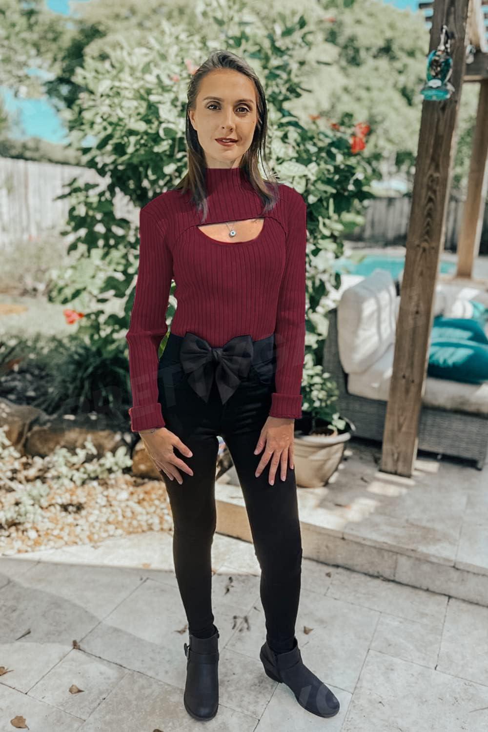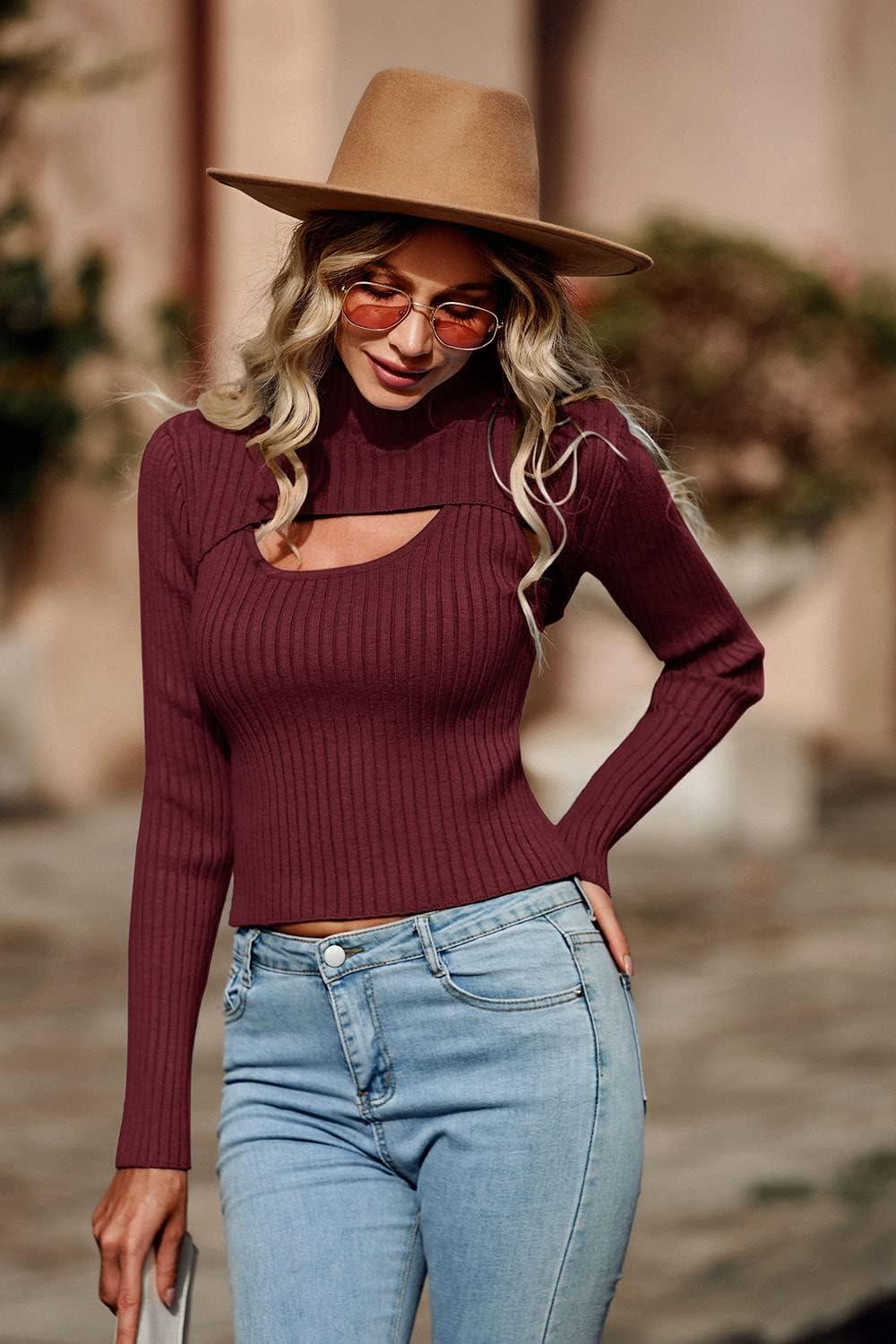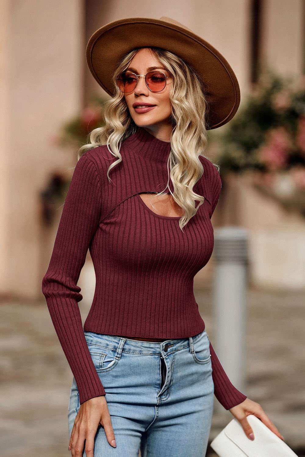 PRETTYGARDEN Women’s 2025 Fashion Fall Clothes 2 Piece Cutout Tops Long Sleeve Mock Neck Rib Knit Winter Pullover Sweater(Wine Red)