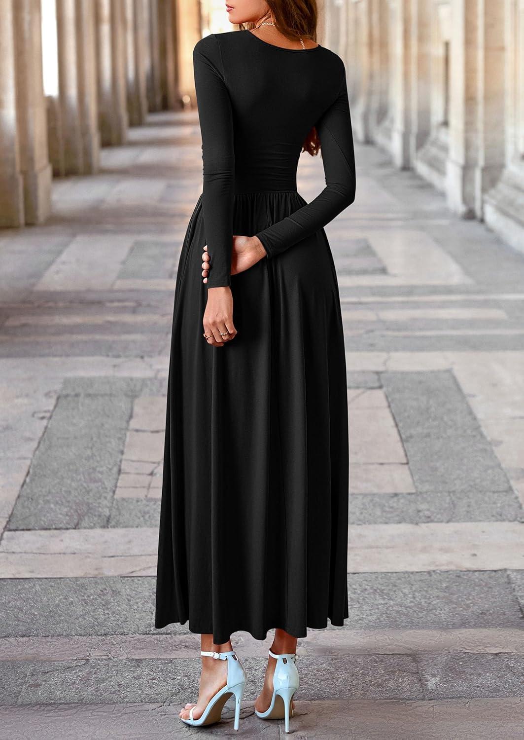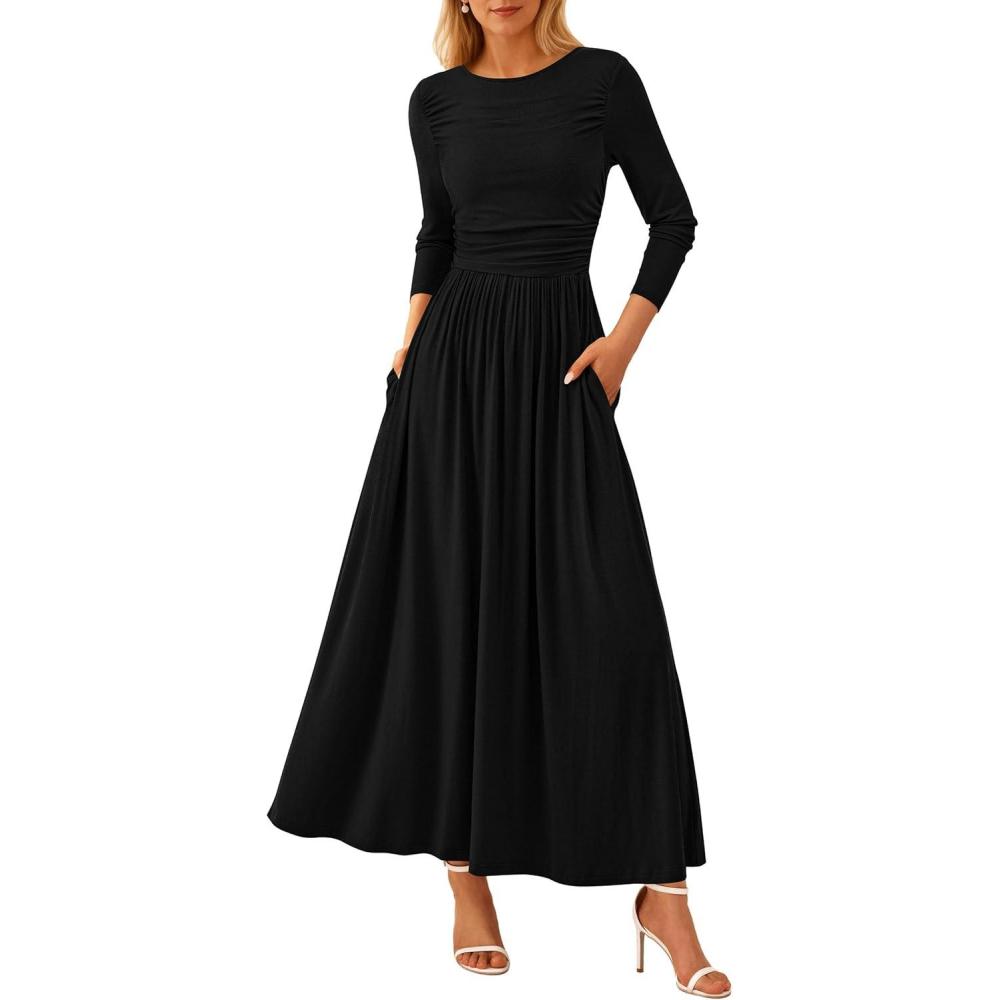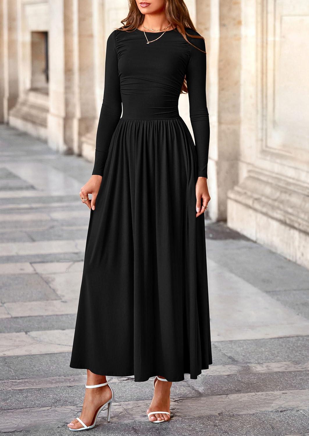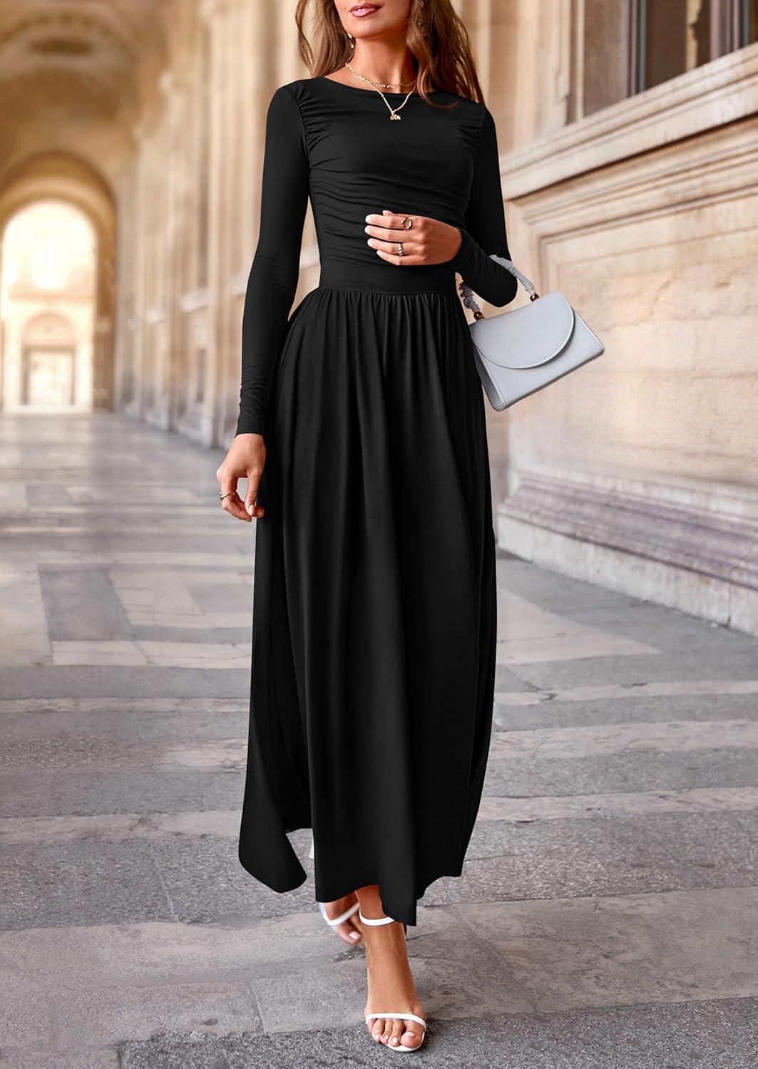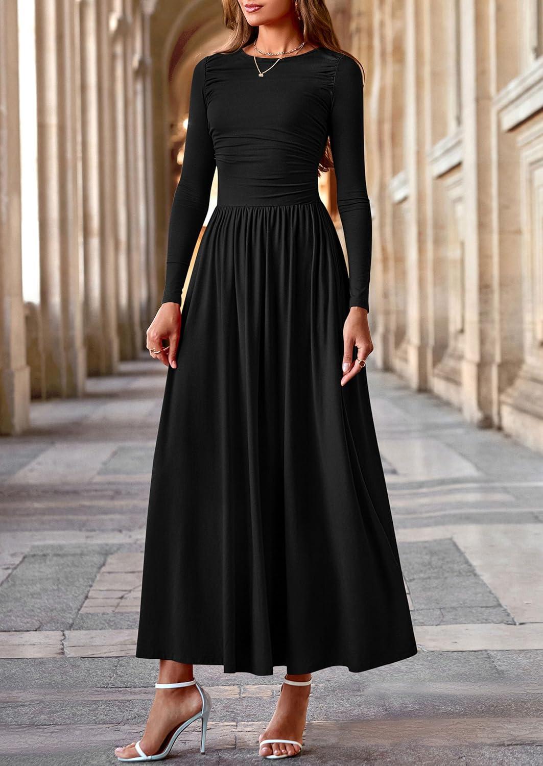 PRETTYGARDEN Women's 2025 Fashion Trendy Fall Long Sleeve Dresses Ruched Flowy Elegant Modest Boho Casual Beach Maxi Dress(Black)