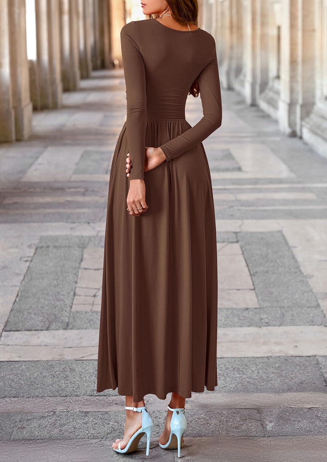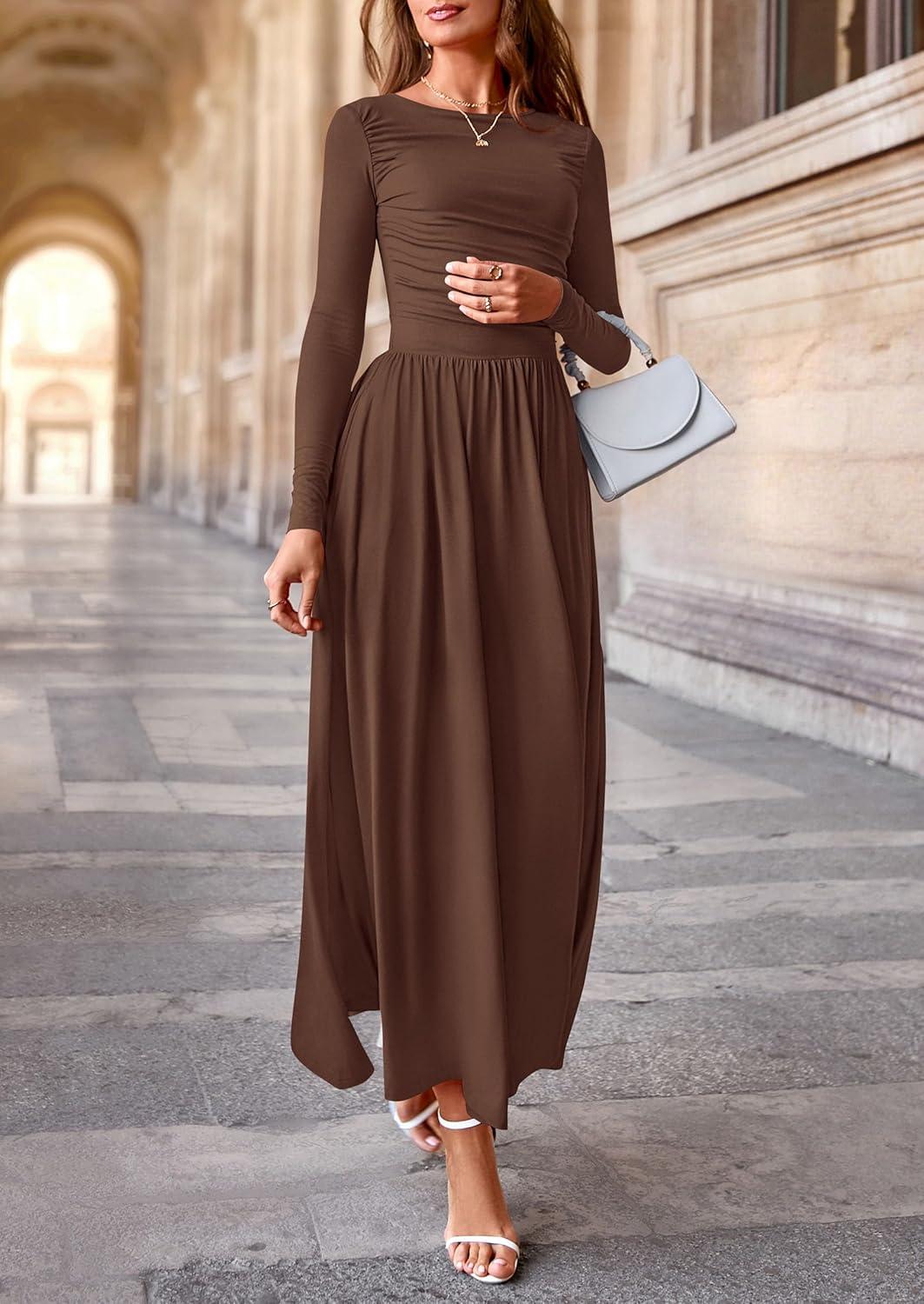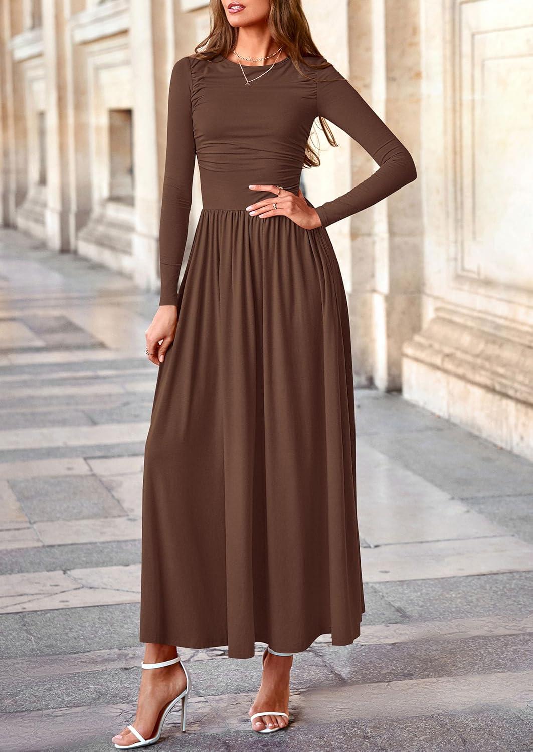 PRETTYGARDEN Women’s 2025 Fashion Trendy Fall Long Sleeve Dresses Ruched Flowy Elegant Modest Boho Casual Beach Maxi Dress(Coffee)