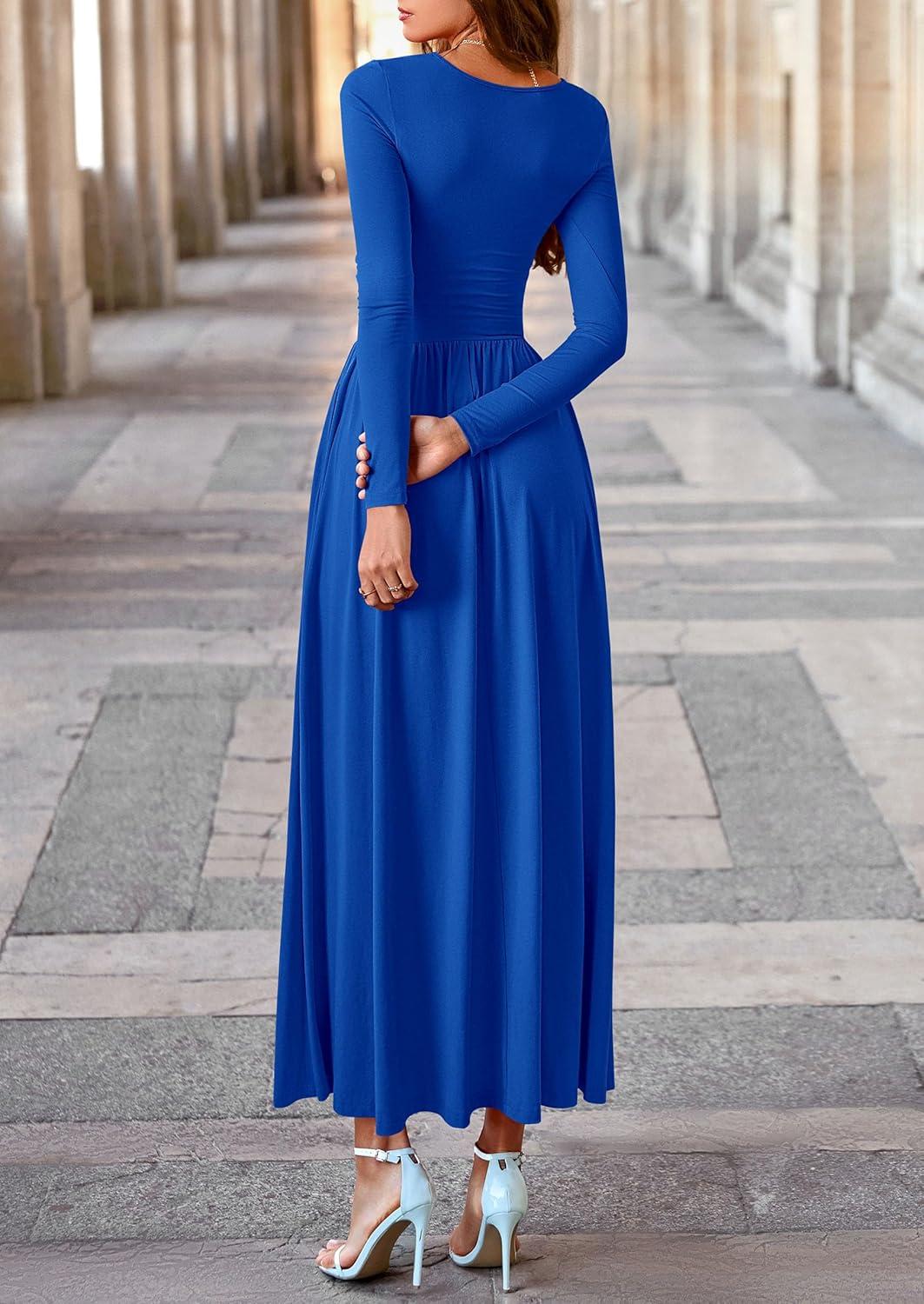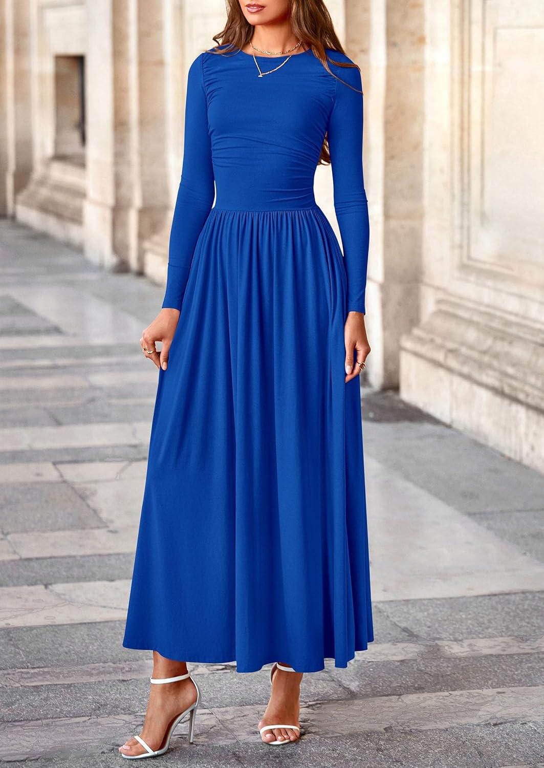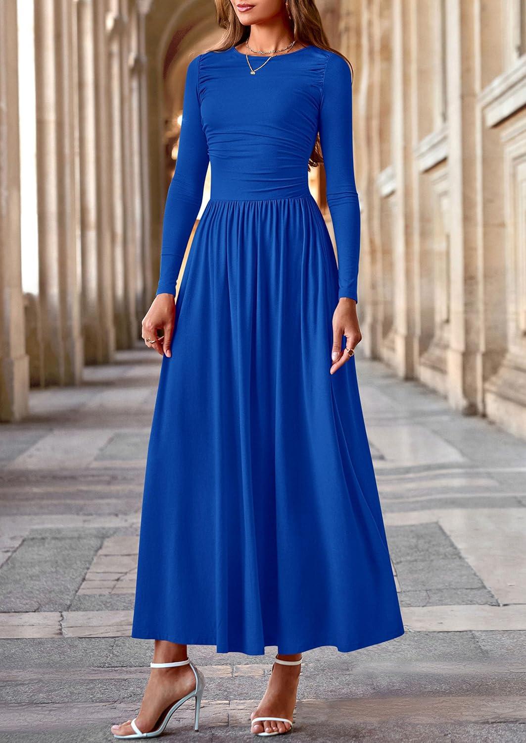 PRETTYGARDEN Women's 2025 Fashion Trendy Fall Long Sleeve Dresses Ruched Flowy Elegant Modest Boho Casual Beach Maxi Dress(Royal Blue)