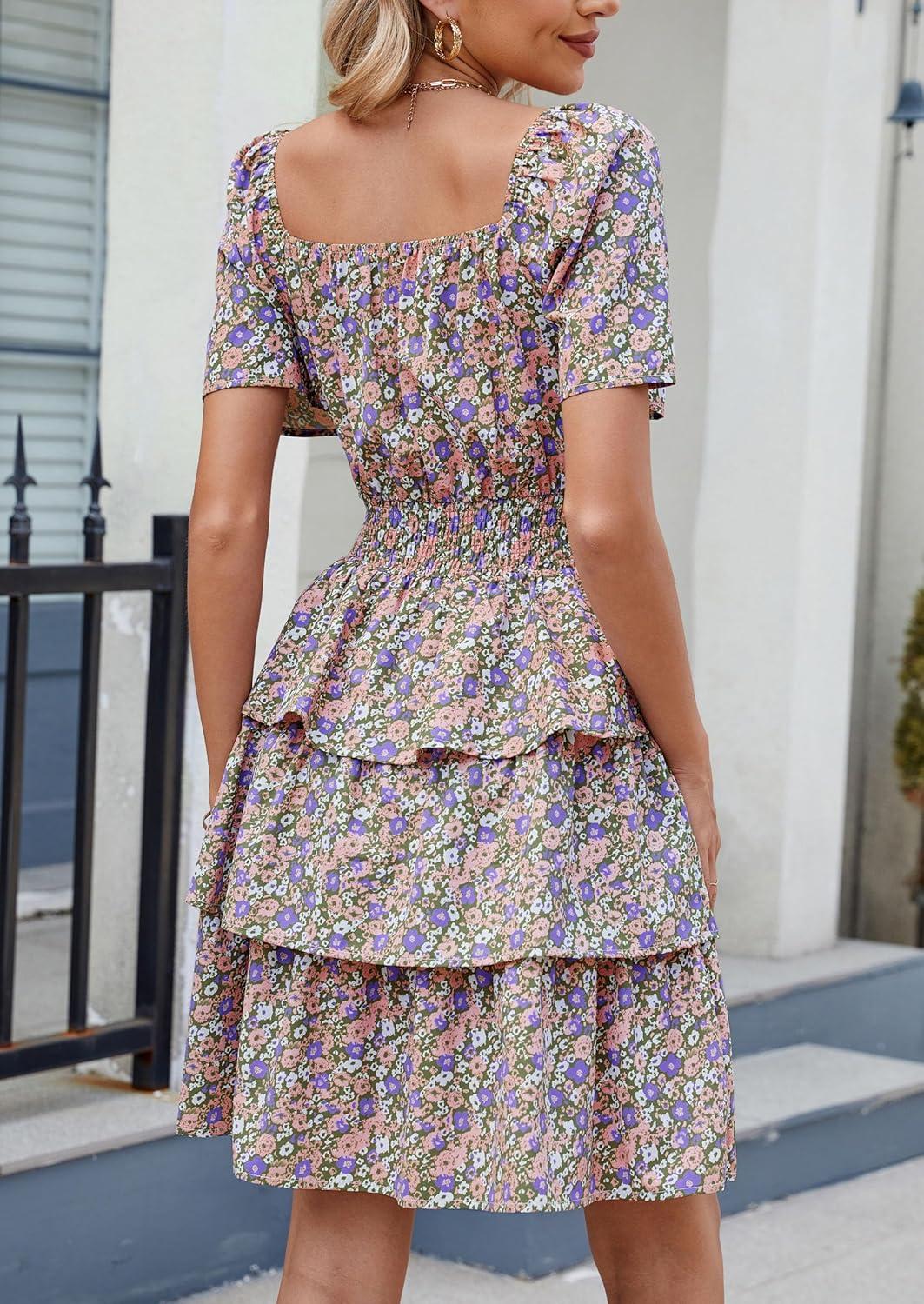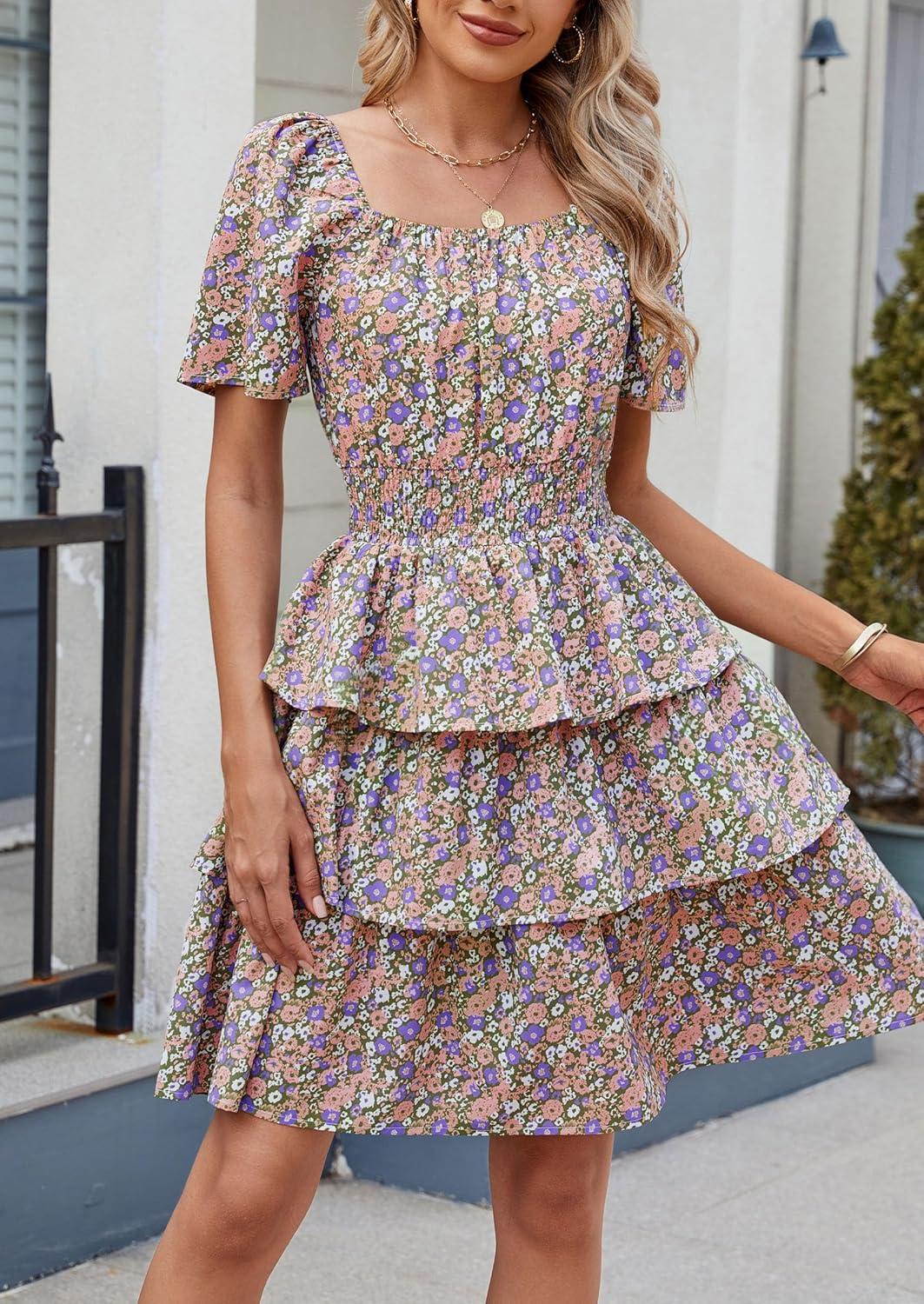 PRETTYGARDEN Women’s 2025 Floral Summer Short Dress Square Neck Short Sleeve Tiered Ruffle Boho Swing Dresses(Army Green Floral)