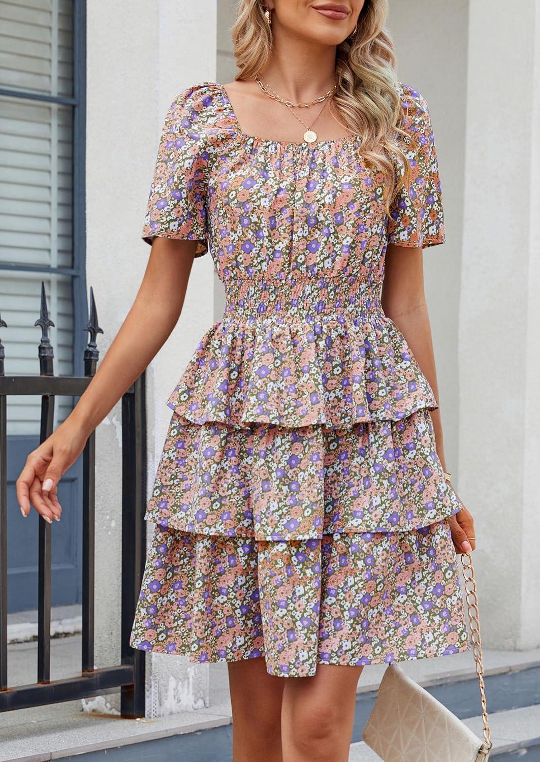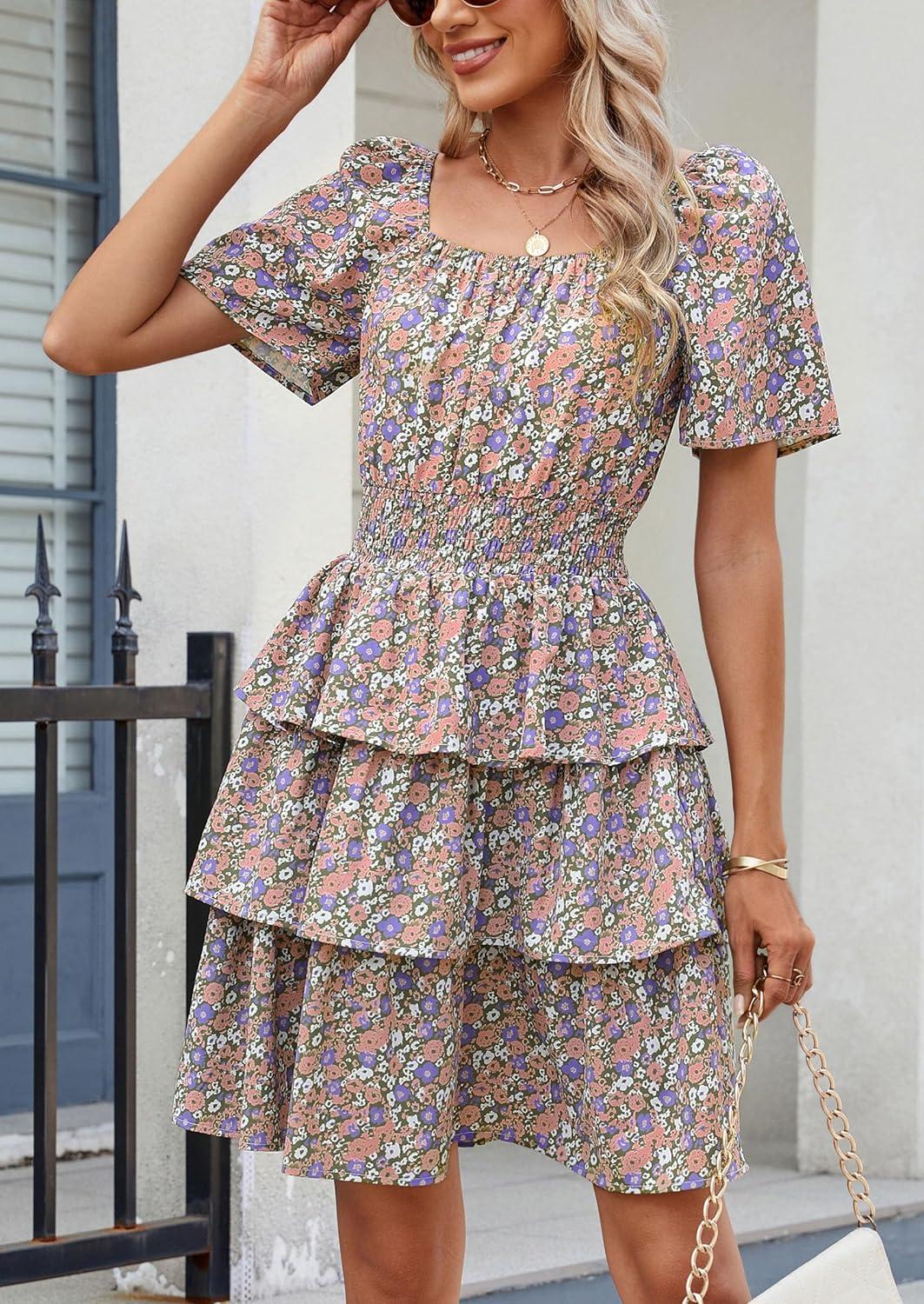PRETTYGARDEN Women's 2025 Floral Summer Short Dress Square Neck Short Sleeve Tiered Ruffle Boho Swing Dresses(Army Green Floral)