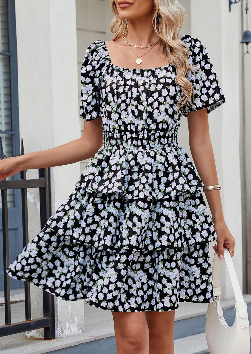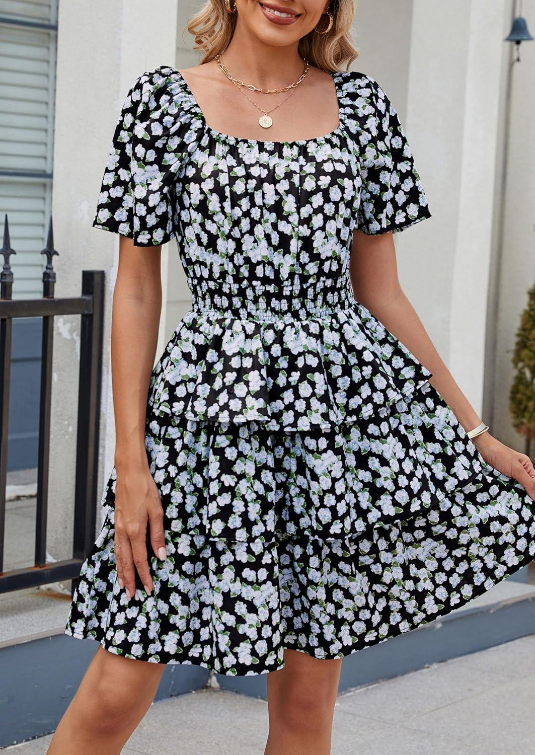 PRETTYGARDEN Women’s 2025 Floral Summer Short Dress Square Neck Short Sleeve Tiered Ruffle Boho Swing Dresses(Black)