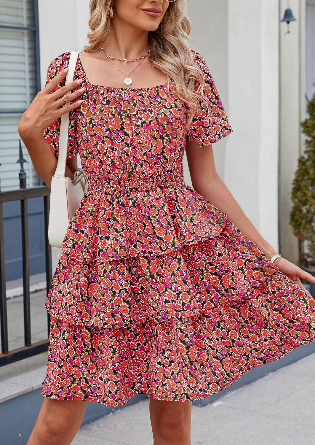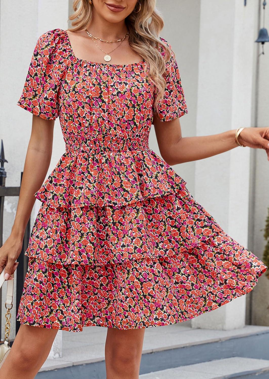 PRETTYGARDEN Women’s 2025 Floral Summer Short Dress Square Neck Short Sleeve Tiered Ruffle Boho Swing Dresses(Black Orange Floral)
