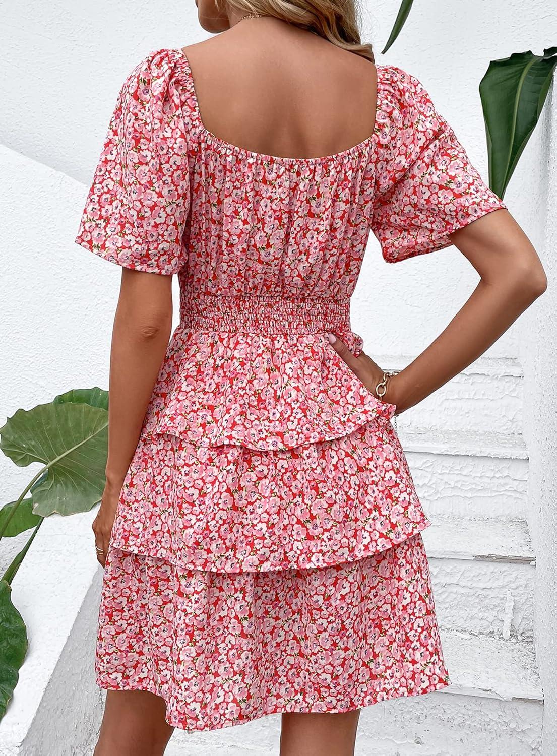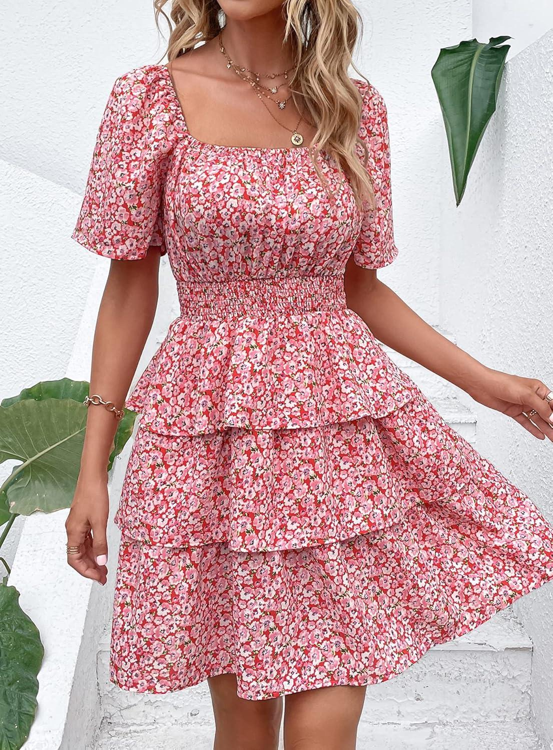 PRETTYGARDEN Women’s 2025 Floral Summer Short Dress Square Neck Short Sleeve Tiered Ruffle Boho Swing Dresses(Red Floral)