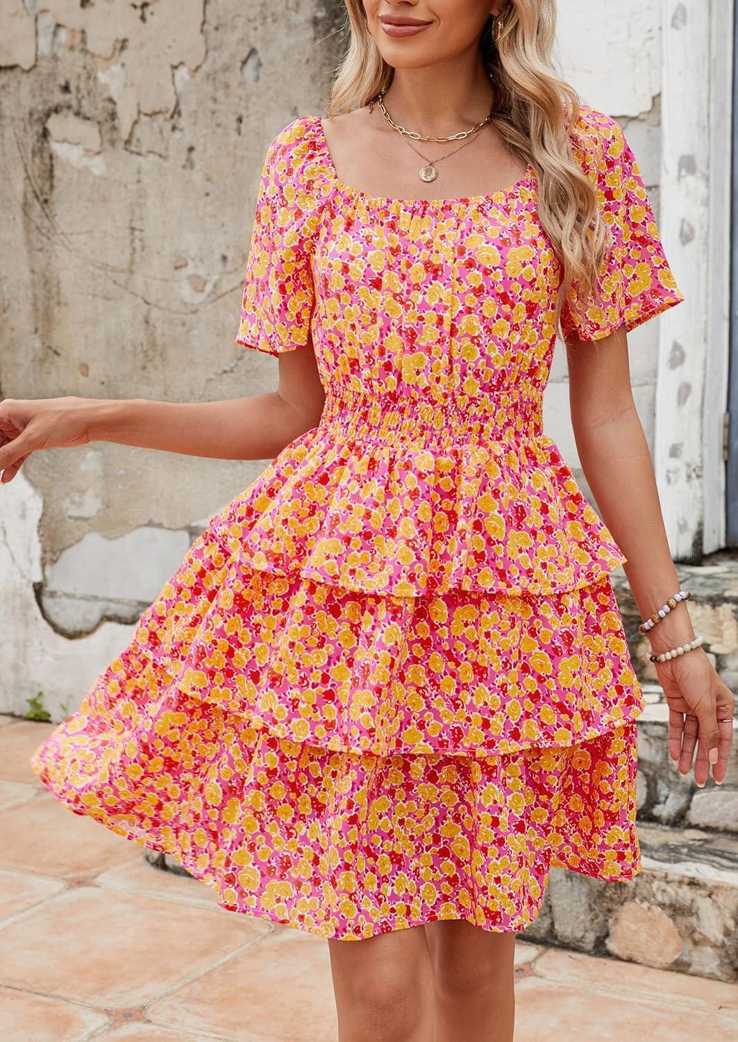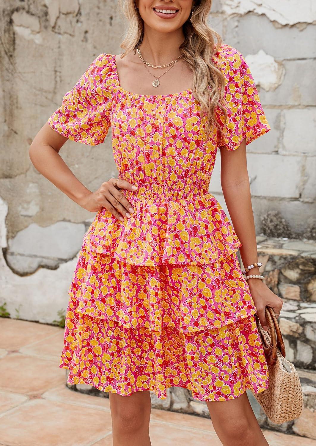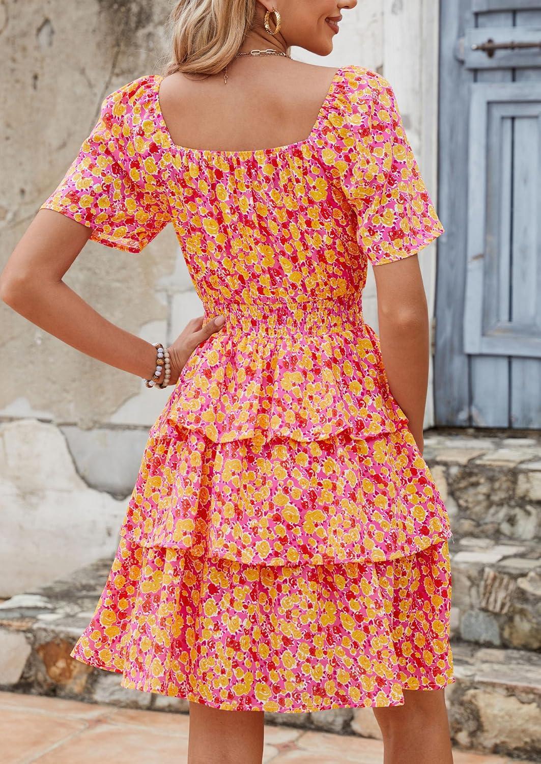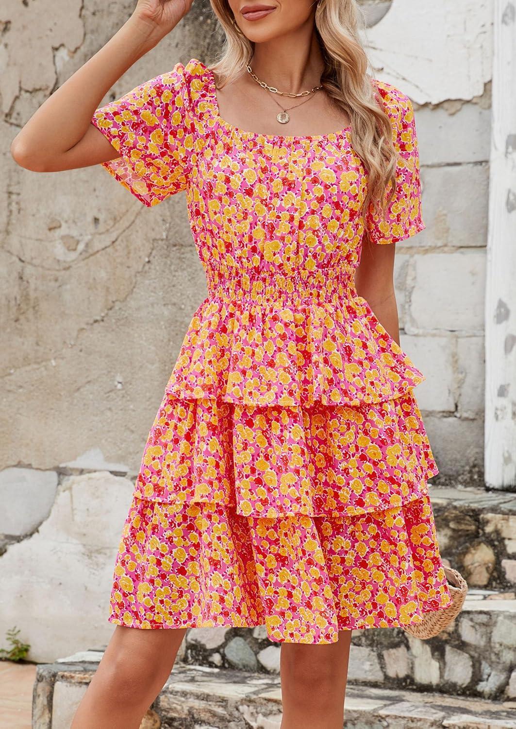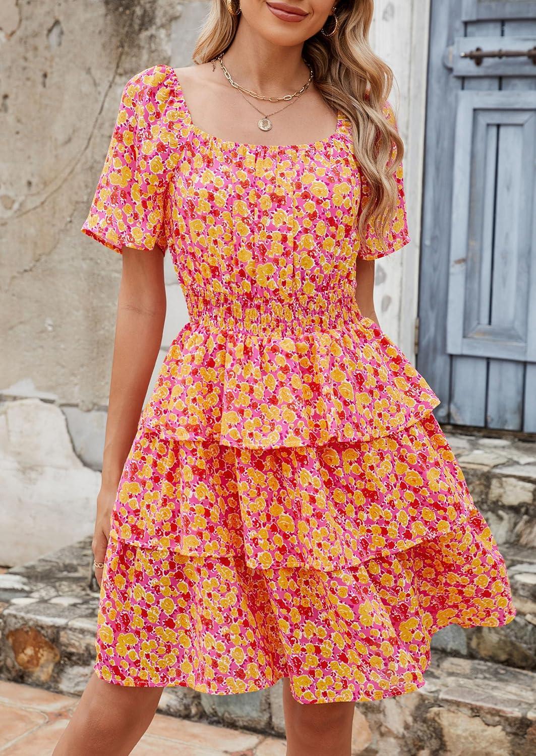 PRETTYGARDEN Women’s 2025 Floral Summer Short Dress Square Neck Short Sleeve Tiered Ruffle Boho Swing Dresses(Turmeric)