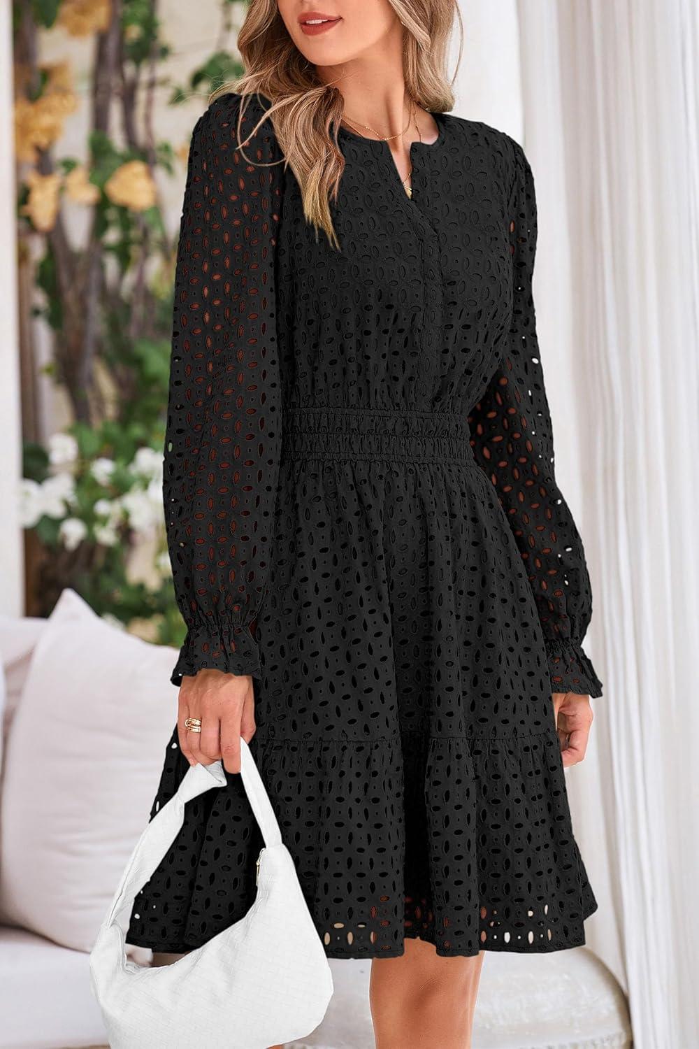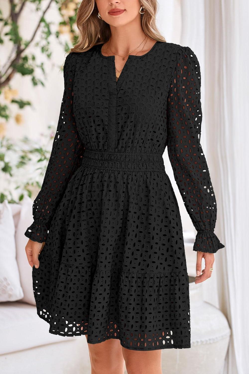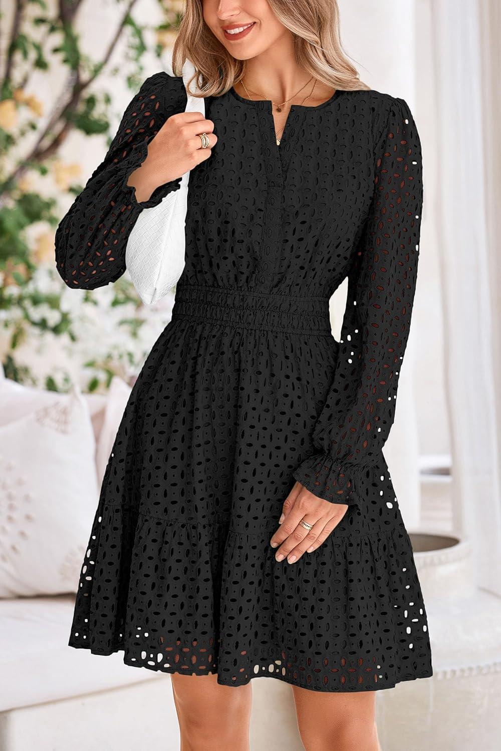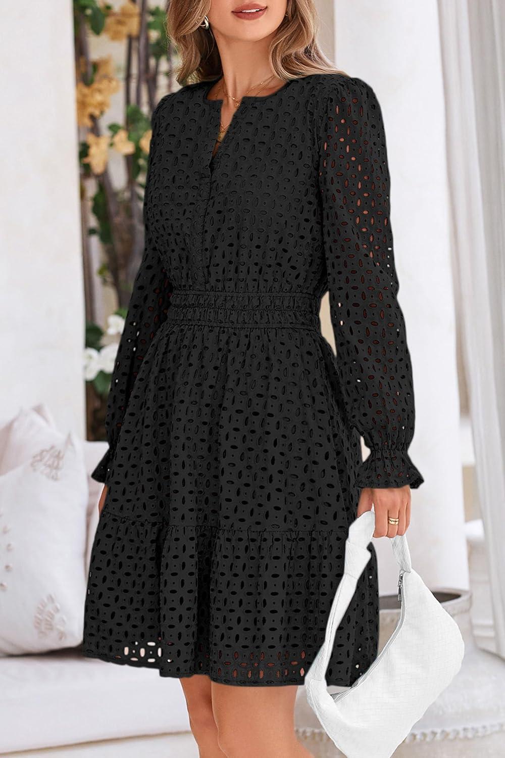 PRETTYGARDEN Women's 2025 Long Sleeve Mini Dress Eyelet V Neck A Line Casual Elegant Holiday Wedding Guest Party Dresses(Black)