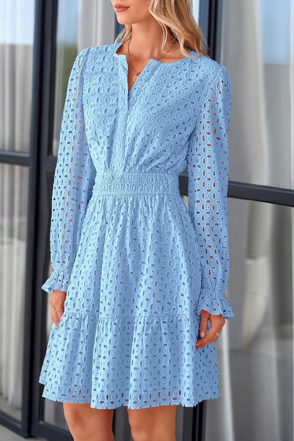 PRETTYGARDEN Women’s 2025 Long Sleeve Mini Dress Eyelet V Neck A Line Casual Elegant Holiday Wedding Guest Party Dresses(Light Blue)