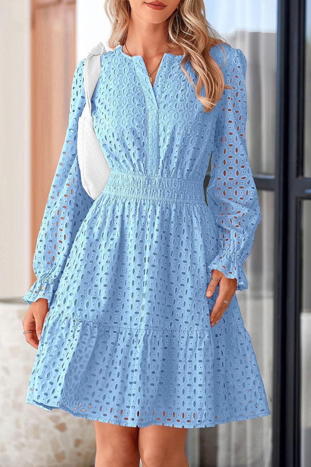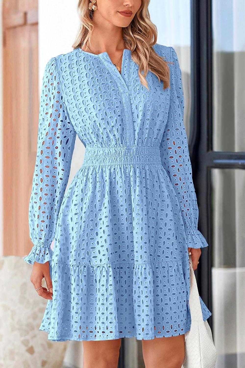 PRETTYGARDEN Women's 2025 Long Sleeve Mini Dress Eyelet V Neck A Line Casual Elegant Holiday Wedding Guest Party Dresses(Light Blue)
